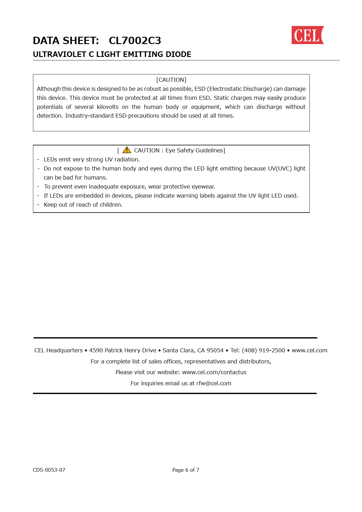 [CAUTION] Although this device is designed to be as robust as possible, ESD (Electrostatic Discharge) can damage this device. This device must be protected at all times from ESD. Static charges may easily produce potentials of several kilovolts on the human body or equipment, which can discharge without detection. Industry-standard ESD precautions should be used at all times. [ CAUTION : Eye Safety Guidelines] ・ LEDs emit very strong UV radiation. ・ Do not expose to the human body and eyes during the LED light emitting because UV(UVC) light can be bad for humans. ・ To prevent even inadequate exposure, wear protective eyewear. ・ If LEDs are embedded in devices, please indicate warning labels against the UV light LED used. ・ Keep out of reach of children. CEL Headquarters • 4590 Patrick Henry Drive • Santa Clara, CA 95054 • Tel: (408) 919-2500 • www.cel.com For a complete list of sales offices, representatives and distributors, Please visit our website: www.cel.com/contactus For inquiries email us at rfw@cel.com CDS-0053-07 Page 6 of 7