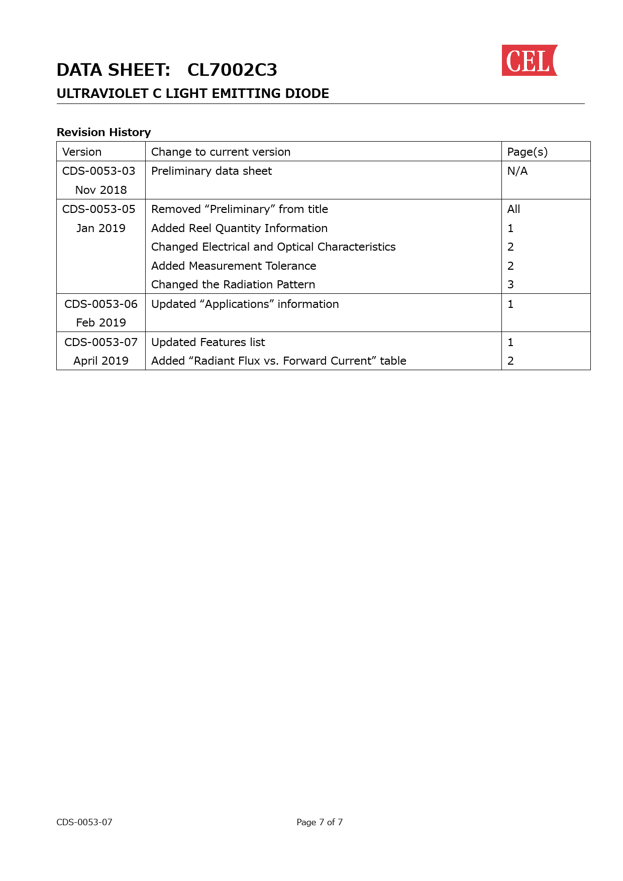 DATA SHEET: CL7002C3 ULTRAVIOLET C LIGHT EMITTING DIODE Revision History