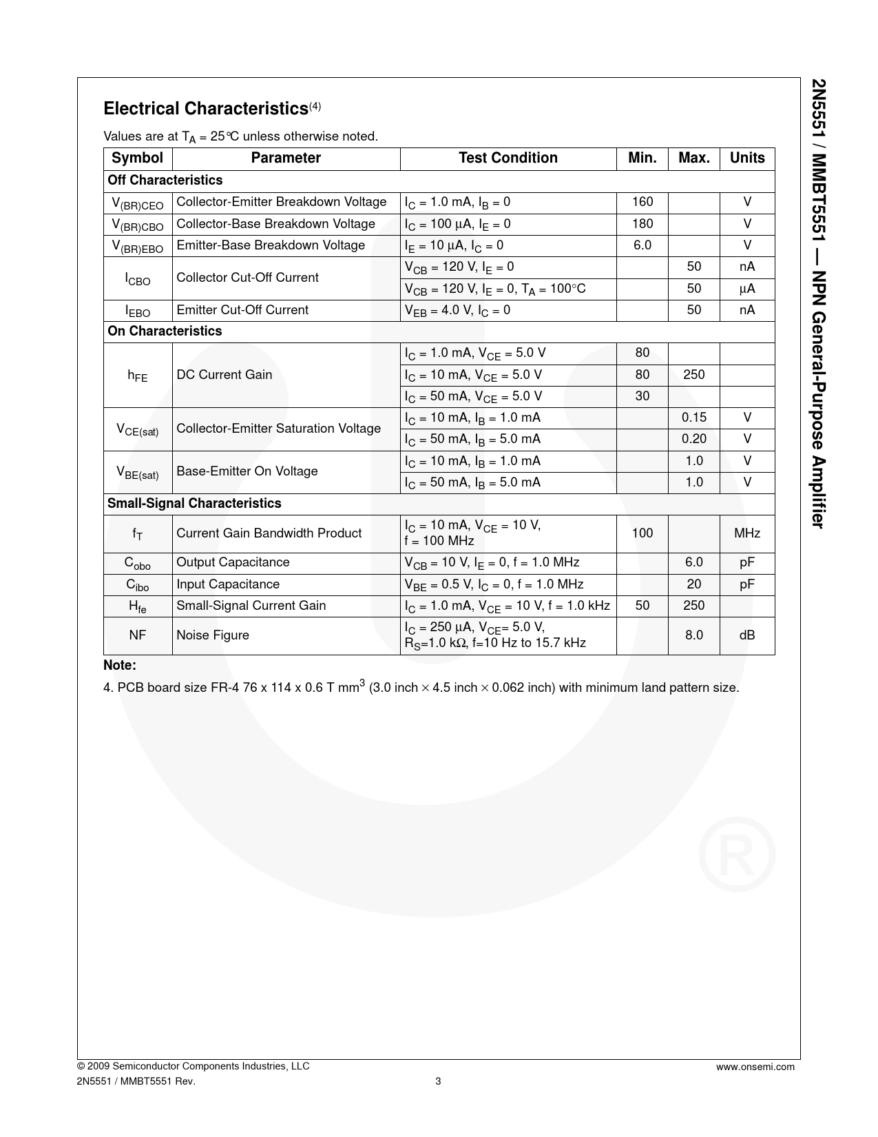 4. PCB board size FR-4 76 x 114 x 0.6 T mm3 (3.0 inch × 4.5 inch × 0.062 inch) with minimum land pattern size. © 2009 Semiconductor Components Industries, LLC www.onsemi.com 2N5551 / MMBT5551 Rev. 3