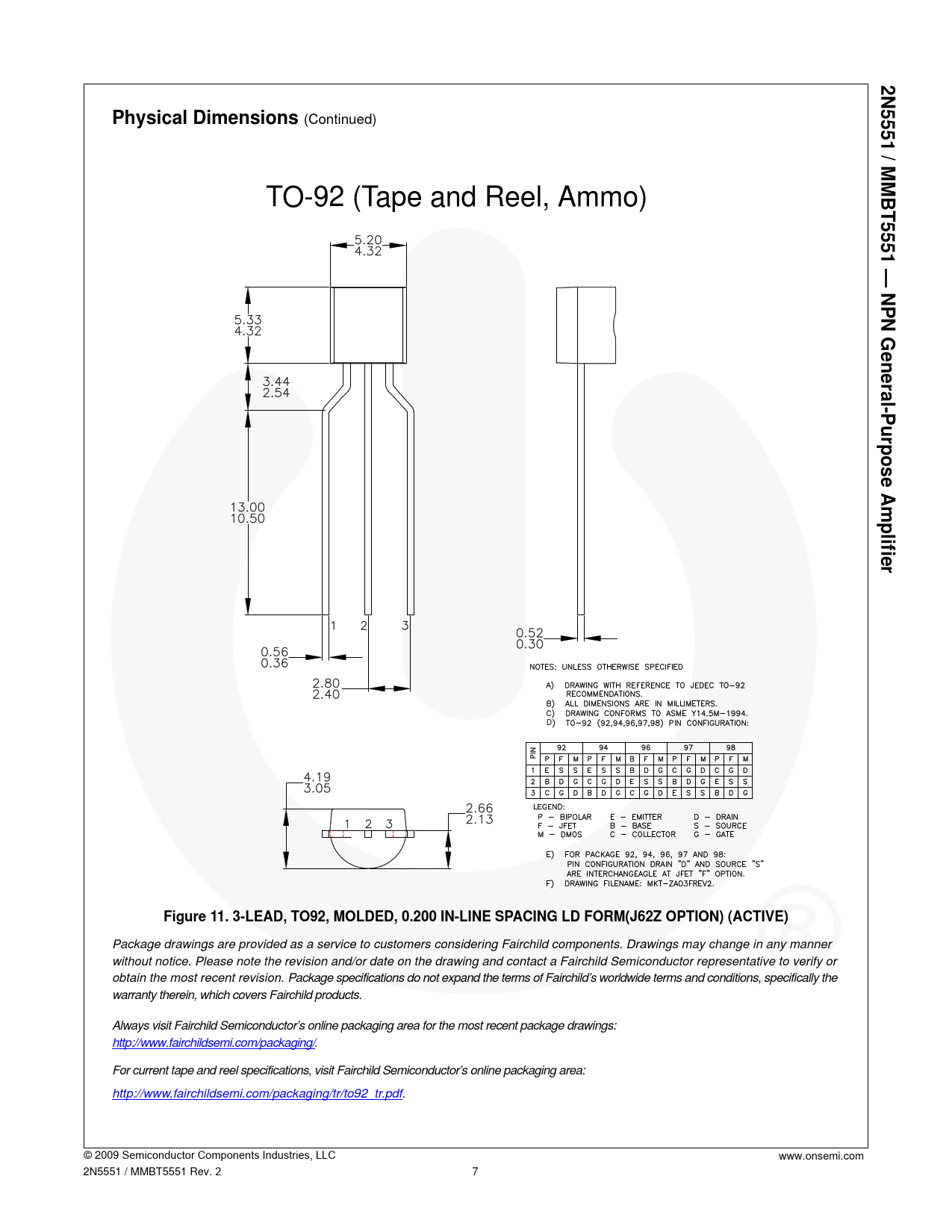 Package drawings are provided as a service to customers considering Fairchild components. Drawings may change in any manner without notice. Please note the revision and/or date on the drawing and contact a Fairchild Semiconductor representative to verify or obtain the most recent revision. Package specifications do not expand the terms of Fairchild’s worldwide terms and conditions, specifically the warranty therein, which covers Fairchild products. Always visit Fairchild Semiconductor’s online packaging area for the most recent package drawings: http://www.fairchildsemi.com/packaging/. For current tape and reel specifications, visit Fairchild Semiconductor’s online packaging area: http://www.fairchildsemi.com/packaging/tr/to92_tr.pdf. © 2009 Semiconductor Components Industries, LLC www.onsemi.com 2N5551 / MMBT5551 Rev. 2 7