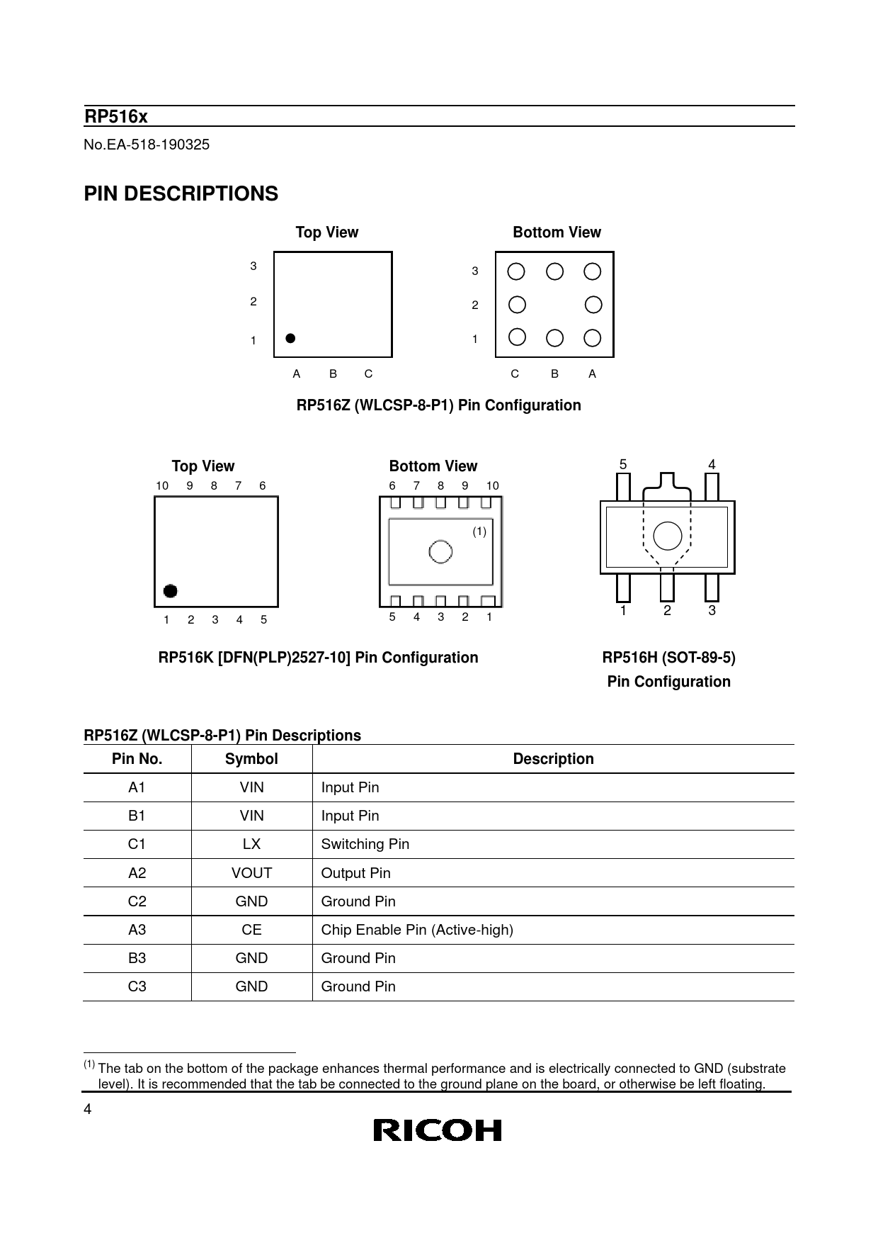 RP516K [DFN(PLP)2527-10] Pin Configuration RP516H (SOT-89-5) Pin Configuration RP516Z (WLCSP-8-P1) Pin Descriptions Pin No. Symbol Description