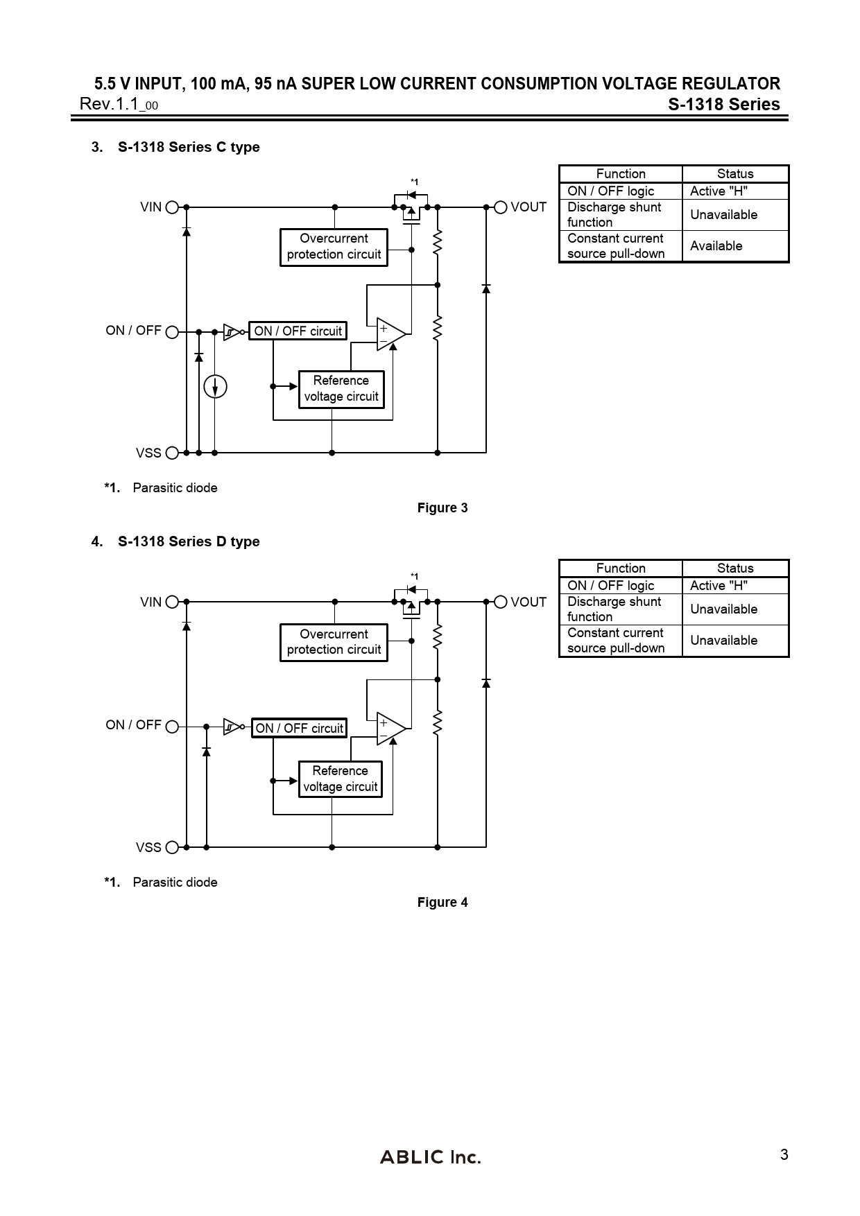 5.5 V INPUT, 100 mA, 95 nA SUPER LOW CURRENT CONSUMPTION VOLTAGE REGULATOR Rev.1.1_00 S-1318 Series3. S-1318 Series C type Function Status *1 ON / OFF logic Active "H" VIN VOUT Discharge shunt Unavailable function Overcurrent Constant current Available protection circuit source pull-down ON / OFF ON / OFF circuit + − Reference voltage circuit VSS *1. Parasitic diode Figure 34. S-1318 Series D type Function Status *1 ON / OFF logic Active "H" VIN VOUT Discharge shunt Unavailable function Overcurrent Constant current Unavailable protection circuit source pull-down ON / OFF ON / OFF circuit + − Reference voltage circuit VSS *1. Parasitic diode Figure 4 3 Document Outline 空白ページ 空白ページ 空白ページ 空白ページ