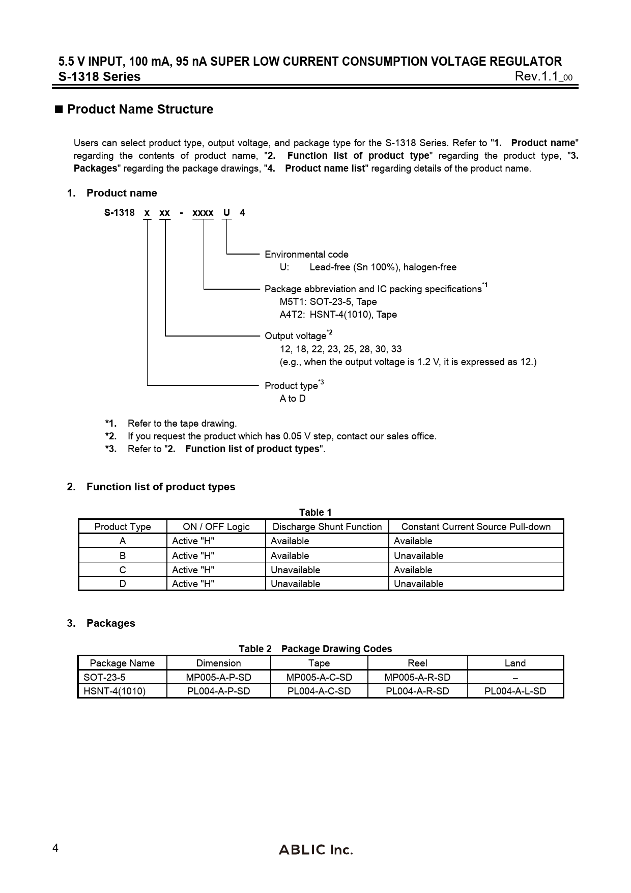 5.5 V INPUT, 100 mA, 95 nA SUPER LOW CURRENT CONSUMPTION VOLTAGE REGULATOR S-1318 Series Product Name Structure