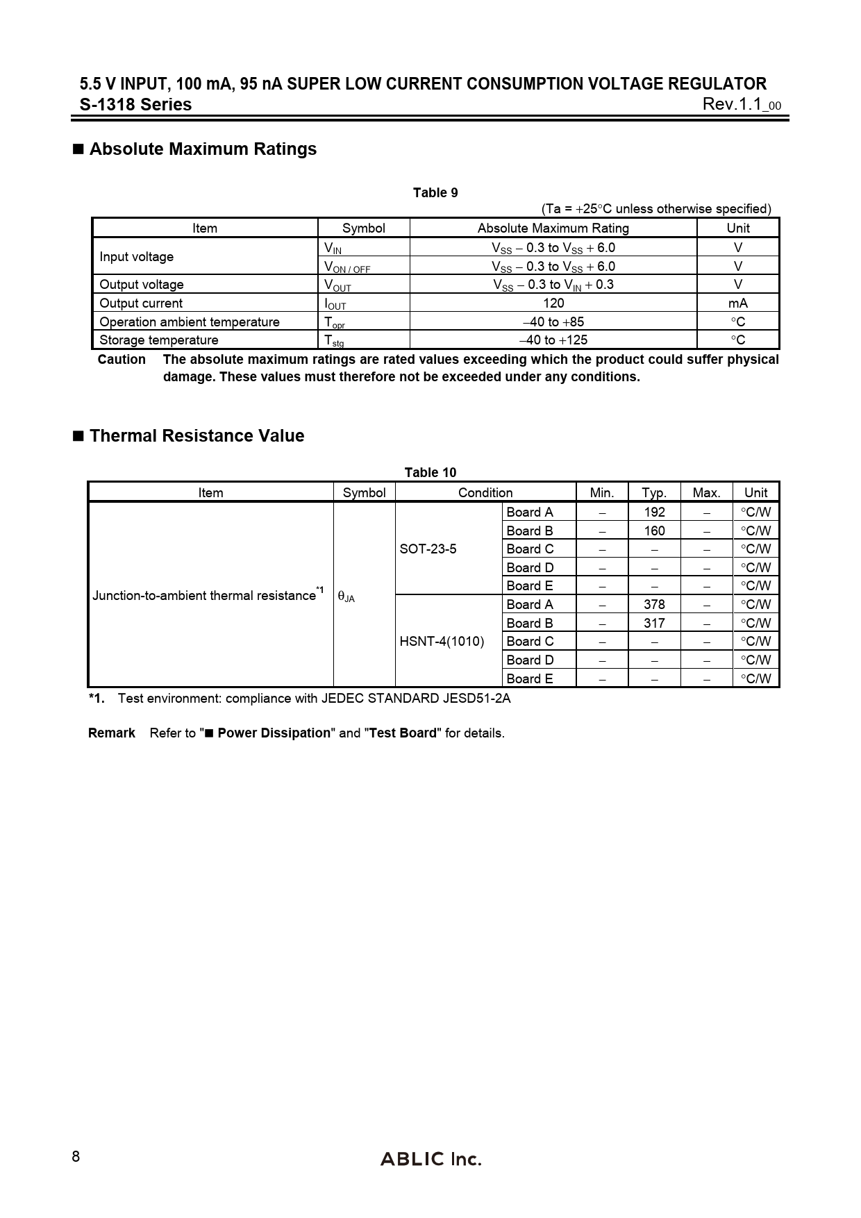 5.5 V INPUT, 100 mA, 95 nA SUPER LOW CURRENT CONSUMPTION VOLTAGE REGULATOR S-1318 Series. Absolute Maximum Ratings. Table 9