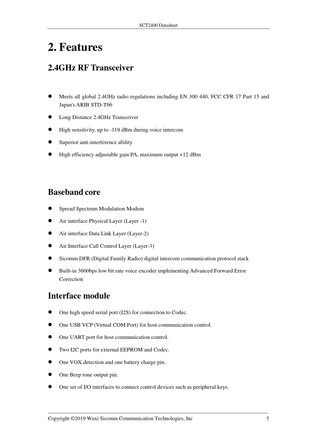 2. Features. 2.4GHz RF Transceiver. Baseband. core. Interface module