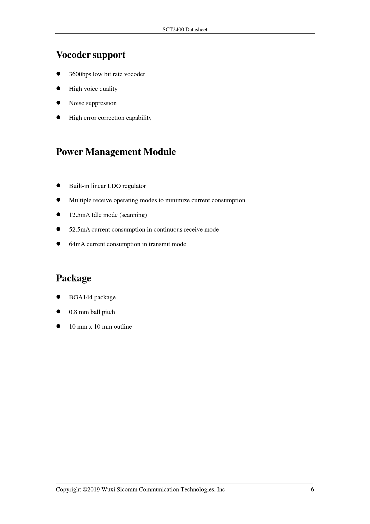 BGA144 package 0.8 mm ball pitch 10 mm x 10 mm outline Copyright ©2019 Wuxi Sicomm Communication Technologies, Inc 6 Document Outline Datasheet Front Page Change History 1. Overview 2. Features 3. Pin Configuration 4. RF Transceiver 4.1. Transmitter 4.2. Receiver 4.3. PLL&VCO 4.4. RC Oscillator 4.5. RF Front-end circuit 5. Baseband Core 5.1. Overview 5.2. Modem 5.3. DFR Protocol Stack 5.3.1. DFR Transmitter Signal Flow 5.3.2. DFR Receiver Signal Flow 6. Programmable Function Keys 7. Control Command Protocol 8. Interface and Timing Sequence 8.1. Power Supply 8.2. Reset and Power Up Timing 8.2.1. Baseband Core Operating Frequency 8.2.2. BOOT Mode 8.3. I2S High-speed Serial Port Timing 8.4. I2C Interface 8.5. UART Interface 8.6. USB Interface 8.7. Other Interfaces 9. Battery Management 10. Specification 10.1. Recommended Operating Conditions 10.2. Power Consumption 10.3. ESD 10.4. Parameter Performance 11. Reference Schematic Diagram 12. Text messaging support 13. Package Information 14. Ordering Information Appendix A End of Document