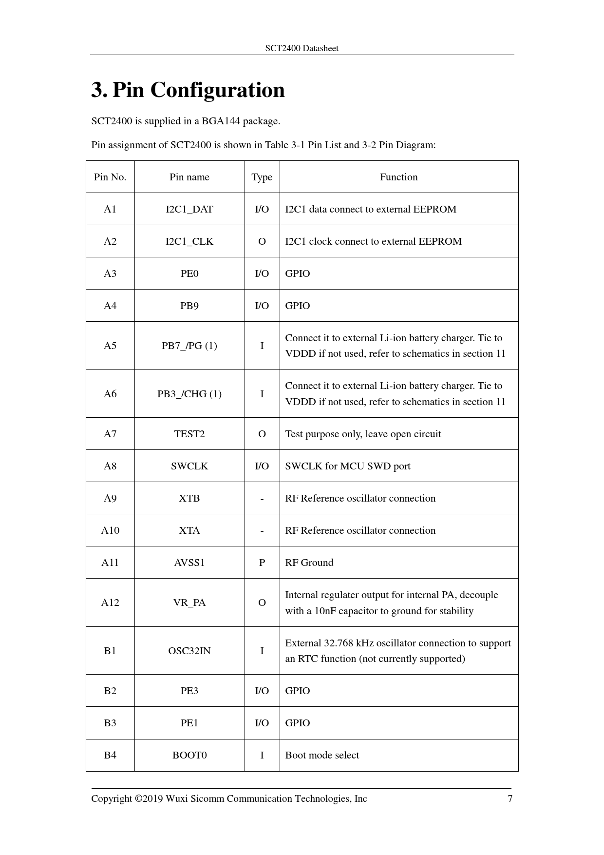 SCT2400 is supplied in a BGA144 package. Pin assignment of SCT2400 is shown in Table 3-1 Pin List and 3-2 Pin Diagram: Pin No. Pin name Type Function A1 I2C1_DAT I/O I2C1 data connect to external EEPROM A2 I2C1_CLK O I2C1 clock connect to external EEPROM A3 PE0 I/O GPIO A4 PB9 I/O GPIO Connect it to external Li-ion battery charger. Tie to A5 PB7_/PG (1) I VDDD if not used, refer to schematics in section 11 Connect it to external Li-ion battery charger. Tie to A6 PB3_/CHG (1) I VDDD if not used, refer to schematics in section 11 A7 TEST2 O Test purpose only, leave open circuit A8 SWCLK I/O SWCLK for MCU SWD port A9 XTB - RF Reference oscillator connection A10 XTA - RF Reference oscillator connection A11 AVSS1 P RF Ground Internal regulater output for internal PA, decouple A12 VR_PA O with a 10nF capacitor to ground for stability External 32.768 kHz oscillator connection to support B1 OSC32IN I an RTC function (not currently supported) B2 PE3 I/O GPIO B3 PE1 I/O GPIO B4 BOOT0 I Boot mode select Copyright ©2019 Wuxi Sicomm Communication Technologies, Inc 7 Document Outline Datasheet Front Page Change History 1. Overview 2. Features 3. Pin Configuration 4. RF Transceiver 4.1. Transmitter 4.2. Receiver 4.3. PLL&VCO 4.4. RC Oscillator 4.5. RF Front-end circuit 5. Baseband Core 5.1. Overview 5.2. Modem 5.3. DFR Protocol Stack 5.3.1. DFR Transmitter Signal Flow 5.3.2. DFR Receiver Signal Flow 6. Programmable Function Keys 7. Control Command Protocol 8. Interface and Timing Sequence 8.1. Power Supply 8.2. Reset and Power Up Timing 8.2.1. Baseband Core Operating Frequency 8.2.2. BOOT Mode 8.3. I2S High-speed Serial Port Timing 8.4. I2C Interface 8.5. UART Interface 8.6. USB Interface 8.7. Other Interfaces 9. Battery Management 10. Specification 10.1. Recommended Operating Conditions 10.2. Power Consumption 10.3. ESD 10.4. Parameter Performance 11. Reference Schematic Diagram 12. Text messaging support 13. Package Information 14. Ordering Information Appendix A End of Document