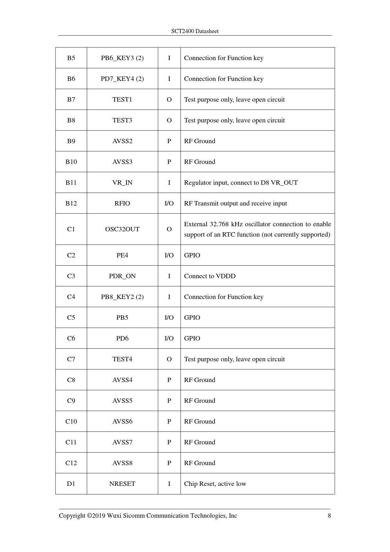 SCT2400 Datasheet B5 PB6_KEY3 (2) I Connection for Function key B6 PD7_KEY4 (2) I Connection for Function key B7 TEST1 O Test purpose only, leave open circuit B8 TEST3 O Test purpose only, leave open circuit B9 AVSS2 P RF Ground B10 AVSS3 P RF Ground B11 VR_IN I Regulator input, connect to D8 VR_OUT B12 RFIO I/O RF Transmit output and receive input External 32.768 kHz oscillator connection to enable C1 OSC32OUT O support of an RTC function (not currently supported) C2 PE4 I/O GPIO C3 PDR_ON I Connect to VDDD C4 PB8_KEY2 (2) I Connection for Function key C5 PB5 I/O GPIO C6 PD6 I/O GPIO C7 TEST4 O Test purpose only, leave open circuit C8 AVSS4 P RF Ground C9 AVSS5 P RF Ground C10 AVSS6 P RF Ground C11 AVSS7 P RF Ground C12 AVSS8 P RF Ground D1 NRESET I Chip Reset, active low Copyright ©2019 Wuxi Sicomm Communication Technologies, Inc 8 Document Outline Datasheet Front Page Change History 1. Overview 2. Features 3. Pin Configuration 4. RF Transceiver 4.1. Transmitter 4.2. Receiver 4.3. PLL&VCO 4.4. RC Oscillator 4.5. RF Front-end circuit 5. Baseband Core 5.1. Overview 5.2. Modem 5.3. DFR Protocol Stack 5.3.1. DFR Transmitter Signal Flow 5.3.2. DFR Receiver Signal Flow 6. Programmable Function Keys 7. Control Command Protocol 8. Interface and Timing Sequence 8.1. Power Supply 8.2. Reset and Power Up Timing 8.2.1. Baseband Core Operating Frequency 8.2.2. BOOT Mode 8.3. I2S High-speed Serial Port Timing 8.4. I2C Interface 8.5. UART Interface 8.6. USB Interface 8.7. Other Interfaces 9. Battery Management 10. Specification 10.1. Recommended Operating Conditions 10.2. Power Consumption 10.3. ESD 10.4. Parameter Performance 11. Reference Schematic Diagram 12. Text messaging support 13. Package Information 14. Ordering Information Appendix A End of Document