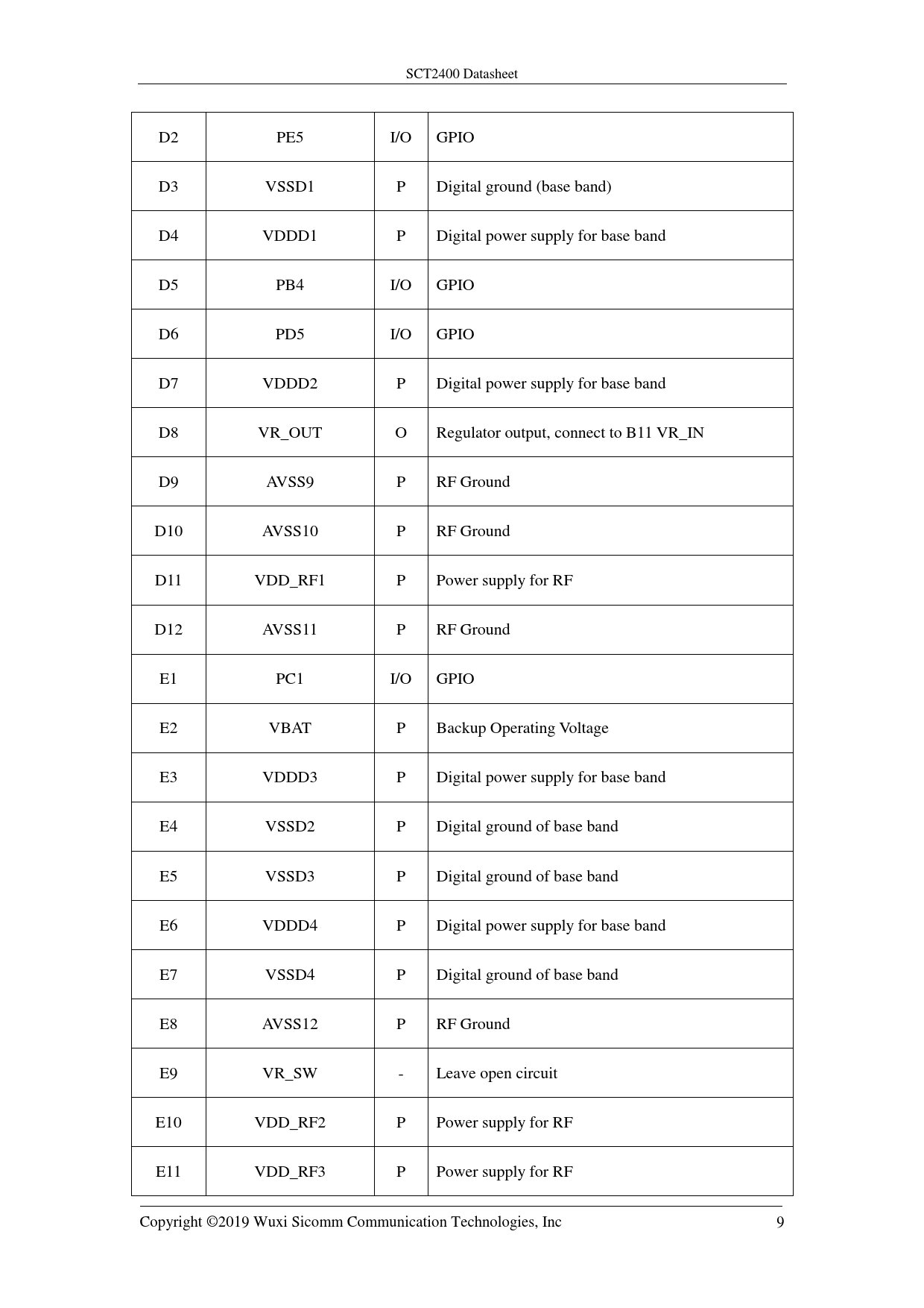 SCT2400 Datasheet D2 PE5 I/O GPIO D3 VSSD1 P Digital ground (base band) D4 VDDD1 P Digital power supply for base band D5 PB4 I/O GPIO D6 PD5 I/O GPIO D7 VDDD2 P Digital power supply for base band D8 VR_OUT O Regulator output, connect to B11 VR_IN D9 AVSS9 P RF Ground D10 AVSS10 P RF Ground D11 VDD_RF1 P Power supply for RF D12 AVSS11 P RF Ground E1 PC1 I/O GPIO E2 VBAT P Backup Operating Voltage E3 VDDD3 P Digital power supply for base band E4 VSSD2 P Digital ground of base band E5 VSSD3 P Digital ground of base band E6 VDDD4 P Digital power supply for base band E7 VSSD4 P Digital ground of base band E8 AVSS12 P RF Ground E9 VR_SW - Leave open circuit E10 VDD_RF2 P Power supply for RF E11 VDD_RF3 P Power supply for RF Copyright ©2019 Wuxi Sicomm Communication Technologies, Inc 9 Document Outline Datasheet Front Page Change History 1. Overview 2. Features 3. Pin Configuration 4. RF Transceiver 4.1. Transmitter 4.2. Receiver 4.3. PLL&VCO 4.4. RC Oscillator 4.5. RF Front-end circuit 5. Baseband Core 5.1. Overview 5.2. Modem 5.3. DFR Protocol Stack 5.3.1. DFR Transmitter Signal Flow 5.3.2. DFR Receiver Signal Flow 6. Programmable Function Keys 7. Control Command Protocol 8. Interface and Timing Sequence 8.1. Power Supply 8.2. Reset and Power Up Timing 8.2.1. Baseband Core Operating Frequency 8.2.2. BOOT Mode 8.3. I2S High-speed Serial Port Timing 8.4. I2C Interface 8.5. UART Interface 8.6. USB Interface 8.7. Other Interfaces 9. Battery Management 10. Specification 10.1. Recommended Operating Conditions 10.2. Power Consumption 10.3. ESD 10.4. Parameter Performance 11. Reference Schematic Diagram 12. Text messaging support 13. Package Information 14. Ordering Information Appendix A End of Document