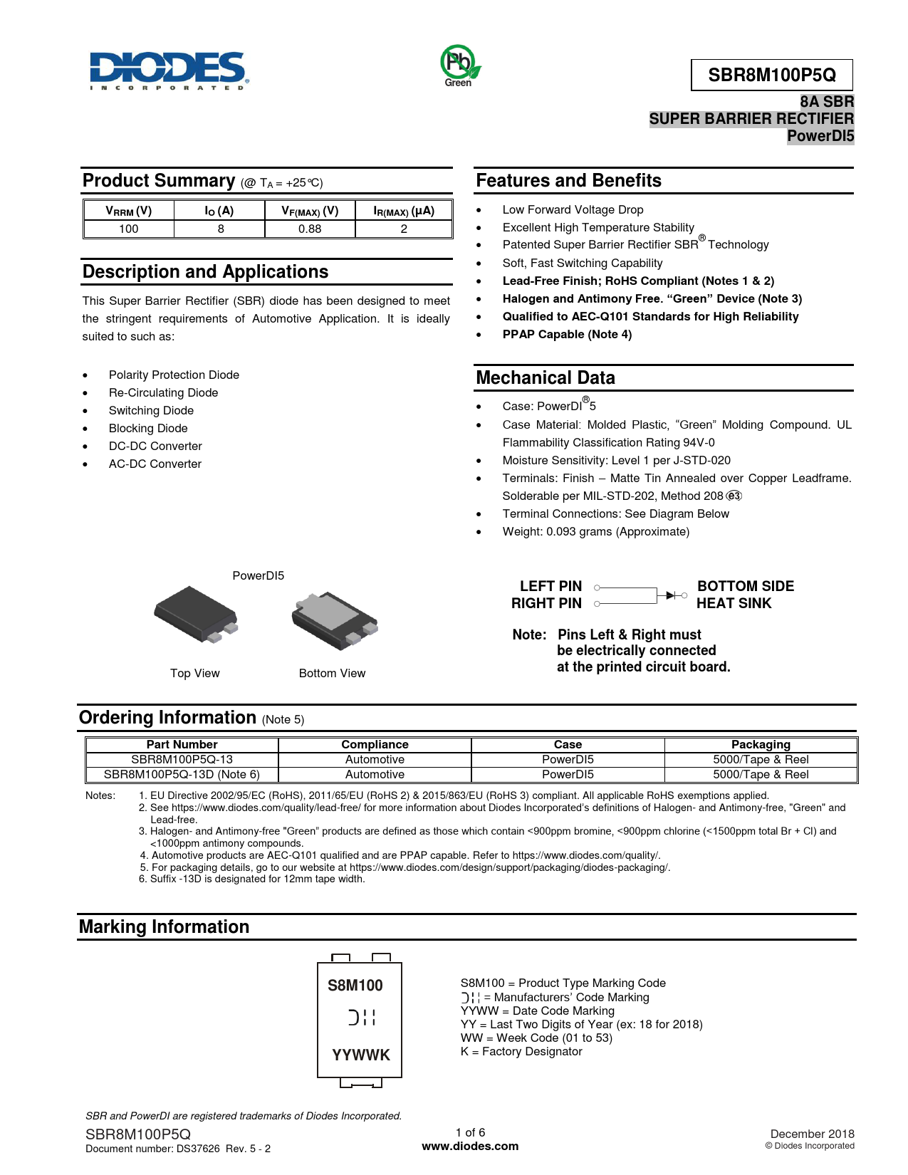 | Seiten / Seite | 6 / 1 — SBR8M100P5Q. Green. 8A SBR. SUPER BARRIER RECTIFIER. PowerDI5. Product … |
