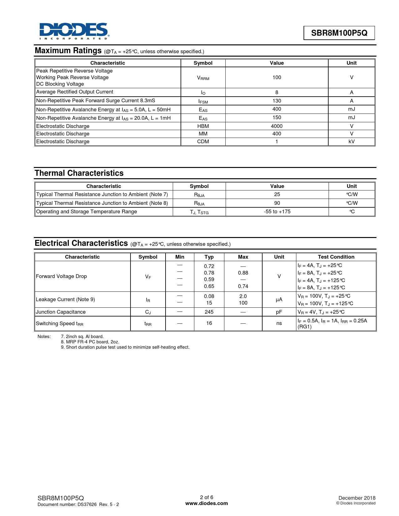 SBR8M100P5Q. Maximum Ratings. Characteristic. Symbol. Value. Unit. Thermal Characteristics. Electrical Characteristics. Min. Typ. Max