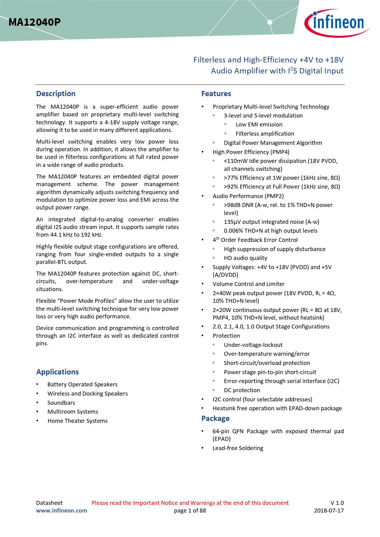 MA12040P Filterless and High-Efficiency +4V to +18V Audio Amplifier with I2S Digital Input DescriptionFeatures The MA12040P is a super-efficient audio power • Proprietary Multi-level Switching Technology amplifier based on proprietary multi-level switching ◦ 3-level and 5-level modulation technology. It supports a 4-18V supply voltage range, ◦ Low EMI emission allowing it to be used in many different applications. ◦ Filterless amplification Multi-level switching enables very low power loss ◦ Digital Power Management Algorithm during operation. In addition, it allows the amplifier to • High Power Efficiency (PMP4) be used in filterless configurations at full rated power ◦ <110mW Idle power dissipation (18V PVDD, in a wide range of audio products. all channels switching) The MA12040P features an embedded digital power ◦ >77% Efficiency at 1W power (1kHz sine, 8Ω) management scheme. The power management ◦ >92% Efficiency at Full Power (1kHz sine, 8Ω) algorithm dynamically adjusts switching frequency and • Audio Performance (PMP2) modulation to optimize power loss and EMI across the output power range. ◦ >98dB DNR (A-w, rel. to 1% THD+N power level) An integrated digital-to-analog converter enables ◦ 135µV output integrated noise (A-w) digital I2S audio stream input. It supports sample rates ◦ 0.006% THD+N at high output levels from 44.1 kHz to 192 kHz. • 4th Order Feedback Error Control Highly flexible output stage configurations are offered, ◦ High suppression of supply disturbance ranging from four single-ended outputs to a single ◦ HD audio quality parallel-BTL output. • Supply Voltages: +4V to +18V (PVDD) and +5V The MA12040P features protection against DC, short- (A/DVDD) circuits, over-temperature and under-voltage • Volume Control and Limiter situations. • 2×40W peak output power (18V PVDD, RL = 4Ω, Flexible “Power Mode Profiles” allow the user to utilize 10% THD+N level) the multi-level switching technique for very low power • 2×20W continuous output power (RL = 8Ω at 18V, loss or very high audio performance. PMP4, 10% THD+N level, without heatsink) Device communication and programming is controlled • 2.0, 2.1, 4.0, 1.0 Output Stage Configurations through an I2C interface as well as dedicated control • Protection pins. ◦ Under-voltage-lockout ◦ Over-temperature warning/error ◦ Short-circuit/overload protection Applications ◦ Power stage pin-to-pin short-circuit ◦ Error-reporting through serial interface (I2C) • Battery Operated Speakers ◦ DC protection • Wireless and Docking Speakers • I2C control (four selectable addresses) • Soundbars • Heatsink free operation with EPAD-down package • Multiroom Systems • Home Theater Systems Package • 64-pin QFN Package with exposed thermal pad (EPAD) • Lead-free Soldering Datasheet Please read the Important Notice and Warnings at the end of this document V 1.0 www.infineon.com page 1 of 88 2018-07-17