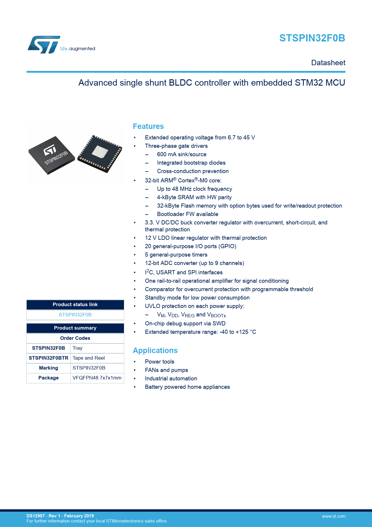 STSPIN32F0B. Features. Product status link. Product summary. Order Codes. Applications. STSPIN32F0BTR. Marking. Package. DS12907. Rev 1
