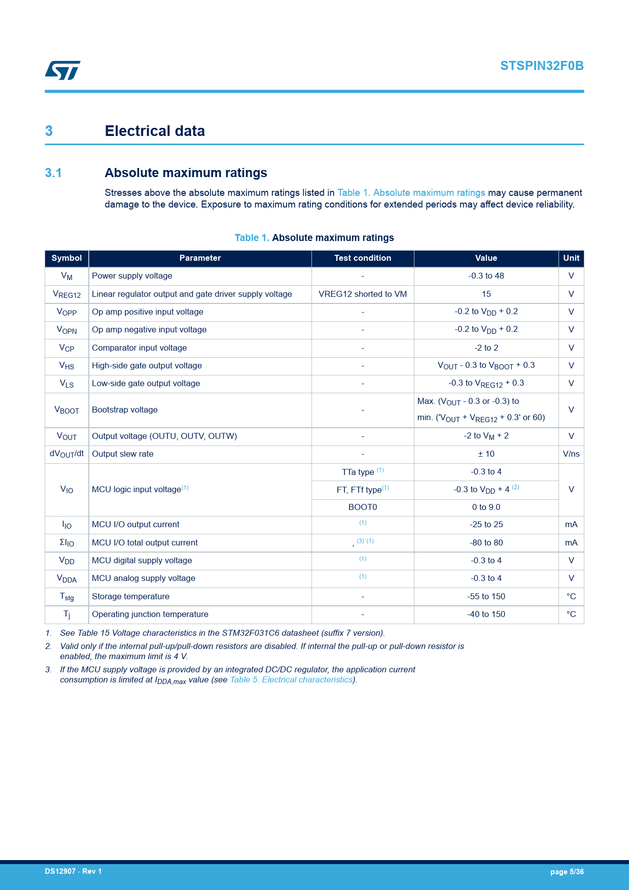 link to page 5 link to page 5 link to page 5 link to page 5 link to page 5 link to page 5 link to page 5 link to page 5 link to page 5 link to page 5 link to page 7 STSPIN32F0B3Electrical data3.1Absolute maximum ratings Stresses above the absolute maximum ratings listed in Table 1. Absolute maximum ratings may cause permanent damage to the device. Exposure to maximum rating conditions for extended periods may affect device reliability. Table 1. Absolute maximum ratingsSymbolParameterTest conditionValueUnit VM Power supply voltage - -0.3 to 48 V VREG12 Linear regulator output and gate driver supply voltage VREG12 shorted to VM 15 V VOPP Op amp positive input voltage - -0.2 to VDD + 0.2 V VOPN Op amp negative input voltage - -0.2 to VDD + 0.2 V VCP Comparator input voltage - -2 to 2 V VHS High-side gate output voltage - VOUT - 0.3 to VBOOT + 0.3 V VLS Low-side gate output voltage - -0.3 to VREG12 + 0.3 V Max. (VOUT - 0.3 or -0.3) to VBOOT Bootstrap voltage - V min. ('VOUT + VREG12 + 0.3' or 60) VOUT Output voltage (OUTU, OUTV, OUTW) - -2 to VM + 2 V dVOUT/dt Output slew rate - ± 10 V/ns TTa type (1) -0.3 to 4 VIO MCU logic input voltage(1) FT, FTf type(1) -0.3 to VDD + 4 (2) V BOOT0 0 to 9.0 IIO MCU I/O output current (1) -25 to 25 mA ΣIIO MCU I/O total output current , (3) (1) -80 to 80 mA VDD MCU digital supply voltage (1) -0.3 to 4 V VDDA MCU analog supply voltage (1) -0.3 to 4 V Tstg Storage temperature - -55 to 150 °C Tj Operating junction temperature - -40 to 150 °C 1. See Table 15 Voltage characteristics in the STM32F031C6 datasheet (suffix 7 version). 2. Valid only if the internal pull-up/pull-down resistors are disabled. If internal the pull-up or pull-down resistor is enabled, the maximum limit is 4 V. 3. If the MCU supply voltage is provided by an integrated DC/DC regulator, the application current consumption is limited at IDDA,max value (see Table 5. Electrical characteristics). DS12907 - Rev 1page 5/36 Document Outline 1 Description 2 Block diagrams 3 Electrical data 3.1 Absolute maximum ratings 3.2 ESD protections 3.3 Recommended operating conditions 3.4 Thermal data 4 Electrical characteristics 5 Pin description 6 Device description 6.1 UVLO and thermal protections 6.1.1 UVLO on supply voltages 6.1.2 Thermal protection 6.2 DC/DC buck regulator 6.2.1 External optional 3.3 V supply voltage 6.3 Linear regulator 6.4 Standby mode 6.5 Gate drivers 6.6 Microcontroller unit 6.6.1 Memories and boot mode 6.6.2 Power management 6.6.3 High-speed external clock source 6.6.4 Advanced-control timer (TIM1) 6.7 Test mode 6.8 Operational amplifier 6.9 Comparator 6.10 ESD protection strategy 7 Application example 8 Package information 8.1 VFQFPN48 7 x 7 package information Revision history Contents List of tables List of figures