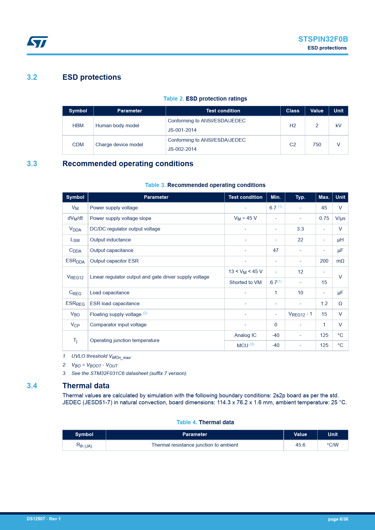STSPIN32F0B ESD protections 3.2 Table 2 ESD protection ratings Symbol Parameter Test condition Class Value Unit 3.3