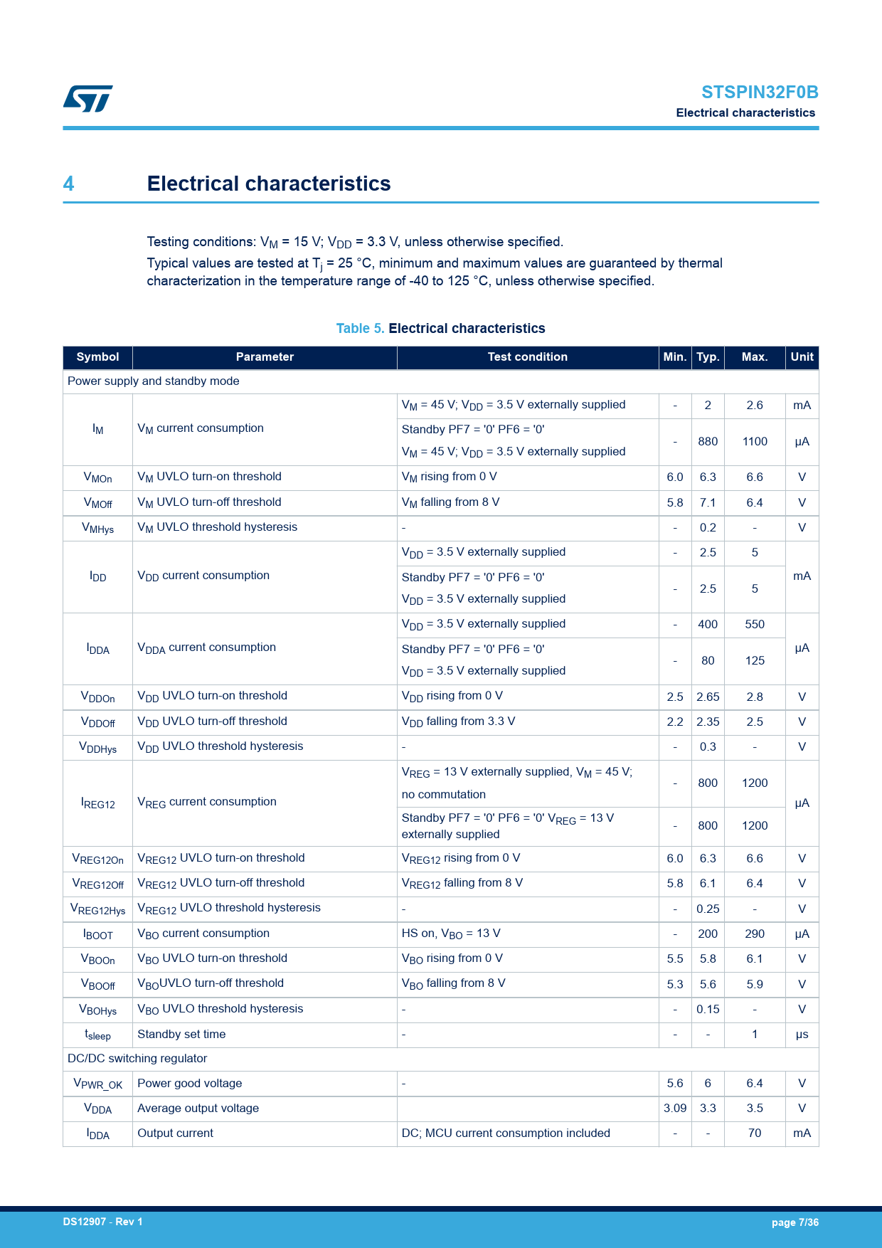 STSPIN32F0B Electrical characteristics Table 5 Electrical characteristics Symbol Parameter Test condition Min Typ Max Unit
