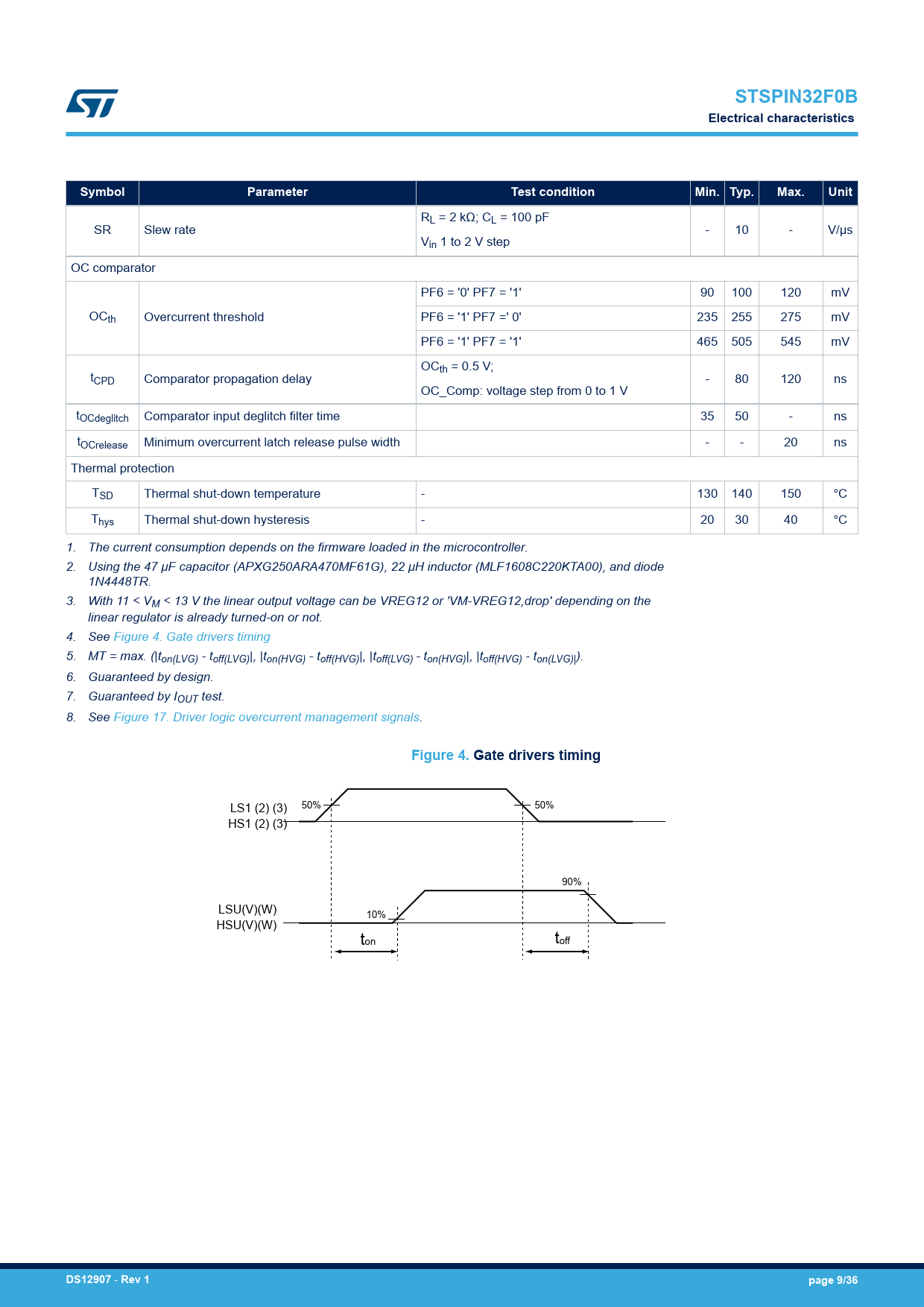 RL = 2 kΩ; CL = 100 pF SR Slew rate - 10 - V/µs Vin 1 to 2 V step OC comparator PF6 = '0' PF7 = '1' 90 100 120 mV OCth Overcurrent threshold PF6 = '1' PF7 =' 0' 235 255 275 mV PF6 = '1' PF7 = '1' 465 505 545 mV OCth = 0.5 V; tCPD Comparator propagation delay - 80 120 ns OC_Comp: voltage step from 0 to 1 V tOCdeglitch Comparator input deglitch filter time 35 50 - ns tOCrelease Minimum overcurrent latch release pulse width - - 20 ns Thermal protection TSD Thermal shut-down temperature - 130 140 150 °C Thys Thermal shut-down hysteresis - 20 30 40 °C 1. The current consumption depends on the firmware loaded in the microcontroller. 2. Using the 47 μF capacitor (APXG250ARA470MF61G), 22 μH inductor (MLF1608C220KTA00), and diode 1N4448TR. 3. With 11 < VM < 13 V the linear output voltage can be VREG12 or 'VM-VREG12,drop' depending on the linear regulator is already turned-on or not. 4. See Figure 4. Gate drivers timing 5. MT = max. (|ton(LVG) - toff(LVG)|, |ton(HVG) - toff(HVG)|, |toff(LVG) - ton(HVG)|, |toff(HVG) - ton(LVG)|). 6. Guaranteed by design. 7. Guaranteed by IOUT test. 8. See Figure 17. Driver logic overcurrent management signals.