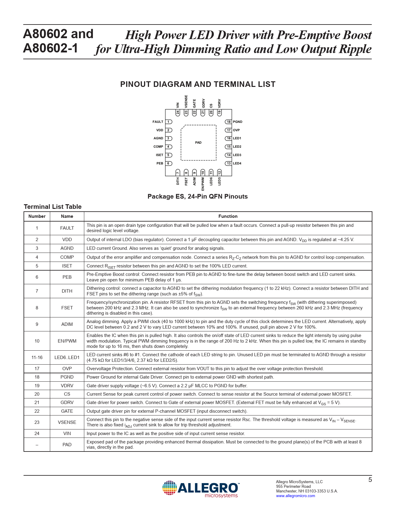 A80602 and High Power LED Driver with Pre-Emptive Boost A80602-1 for Ultra-High Dimming Ratio and Low Output Ripple PINOUT DIAGRAM AND TERMINAL LIST VIN VSENSE GATE GDRV CS VDRV 24 23 22 21 20 19 FAULT 1 18 PGND VDD 2 17 OVP AGND 3 16 LED1 PAD COMP 4 15 LED2 ISET 5 14 LED3 PEB 6 13 LED4 7 8 9 10 11 12 DITH FSET ADIM LED6 LED5 EN/PWM Package ES, 24-Pin QFN Pinouts Terminal List Table Number Name Function