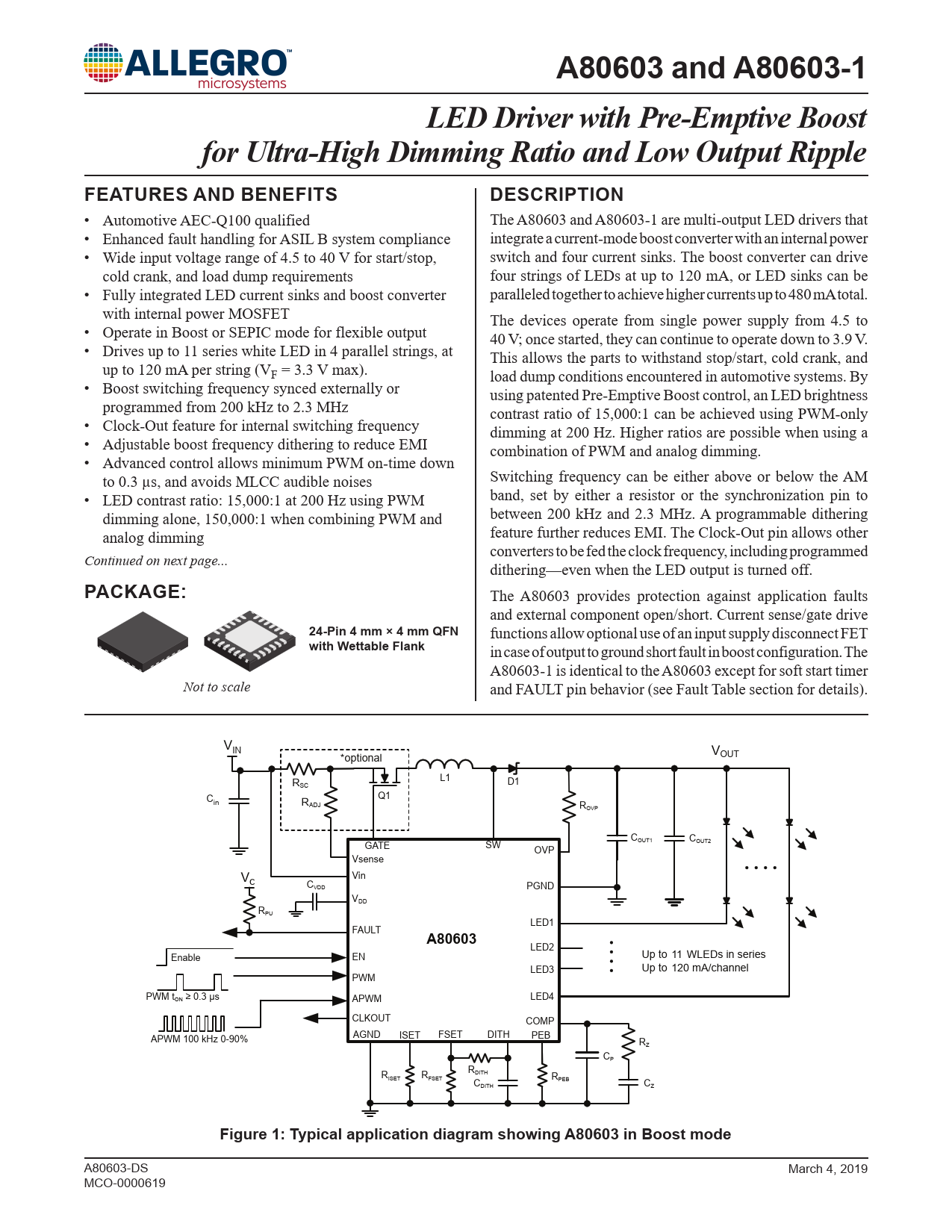 A80603 and A80603-1LED Driver with Pre-Emptive Boostfor Ultra-High Dimming Ratio and Low Output RippleFEATURES AND BENEFITSDESCRIPTION • Automotive AEC-Q100 qualified The A80603 and A80603-1 are multi-output LED drivers that • Enhanced fault handling for ASIL B system compliance integrate a current-mode boost converter with an internal power • Wide input voltage range of 4.5 to 40 V for start/stop, switch and four current sinks. The boost converter can drive cold crank, and load dump requirements four strings of LEDs at up to 120 mA, or LED sinks can be • Fully integrated LED current sinks and boost converter paralleled together to achieve higher currents up to 480 mA total. with internal power MOSFET The devices operate from single power supply from 4.5 to • Operate in Boost or SEPIC mode for flexible output 40 V; once started, they can continue to operate down to 3.9 V. • Drives up to 11 series white LED in 4 parallel strings, at This allows the parts to withstand stop/start, cold crank, and up to 120 mA per string (VF = 3.3 V max). load dump conditions encountered in automotive systems. By • Boost switching frequency synced externally or using patented Pre-Emptive Boost control, an LED brightness programmed from 200 kHz to 2.3 MHz contrast ratio of 15,000:1 can be achieved using PWM-only • Clock-Out feature for internal switching frequency dimming at 200 Hz. Higher ratios are possible when using a • Adjustable boost frequency dithering to reduce EMI combination of PWM and analog dimming. • Advanced control allows minimum PWM on-time down Switching frequency can be either above or below the AM to 0.3 µs, and avoids MLCC audible noises band, set by either a resistor or the synchronization pin to • LED contrast ratio: 15,000:1 at 200 Hz using PWM between 200 kHz and 2.3 MHz. A programmable dithering dimming alone, 150,000:1 when combining PWM and feature further reduces EMI. The Clock-Out pin allows other analog dimming converters to be fed the clock frequency, including programmed Continued on next page... dithering—even when the LED output is turned off. PACKAGE: The A80603 provides protection against application faults and external component open/short. Current sense/gate drive 24-Pin 4 mm × 4 mm QFN functions allow optional use of an input supply disconnect FET with Wettable Flank in case of output to ground short fault in boost configuration. The A80603-1 is identical to the A80603 except for soft start timer Not to scale and FAULT pin behavior (see Fault Table section for details). VIN *optional VOUT R L1 SC D1 Q1 Cin RADJ ROVP C C GATE SW OUT1 OUT2 OVP Vsense Vin Vc CVDD PGND VDD RPU LED1 FAULT A80603 LED2 Enable EN Up to 11 WLEDs in series LED3 Up to 120 mA/channel PWM PWM tON ≥ 0.3 µs APWM LED4 CLKOUT COMP AGND ISET FSET DITH PEB APWM 100 kHz 0-90% RZ CP R RDITH ISET RFSET C RPEB DITH CZ Figure 1: Typical application diagram showing A80603 in Boost mode A80603-DS March 4, 2019 MCO-0000619 Document Outline Features and Benefits Description Applications Package Selection Guide Absolute Maximum Ratings Thermal Characteristics Typical Application – SEPIC Functional Block Diagram Pinout Diagram and Terminal List Electrical Characteristics Functional Description Enabling the IC Powering Up: LED Detection Phase Powering Up: Boost Output Undervoltage Soft Start Function Frequency Selection Synchronization Loss of External Sync Signal Switching Frequency Dithering Clock Out Function LED Current Setting PWM Dimming Pre-Emptive Boost (PEB) Analog Dimming with APWM Pin Extending LED Dimming Ratio Analog Dimming with External Voltage VDD Shutdown Fault Detection and Protection LED String Partial-Short Detect Overvoltage Protection Boost Switch Overcurrent Protection Input Overcurrent Protection and Disconnect Switch Setting the Current Sense Resistor Input UVLO Fault Protection During Operation Fault Recovery Mechanism Package Outline Drawing