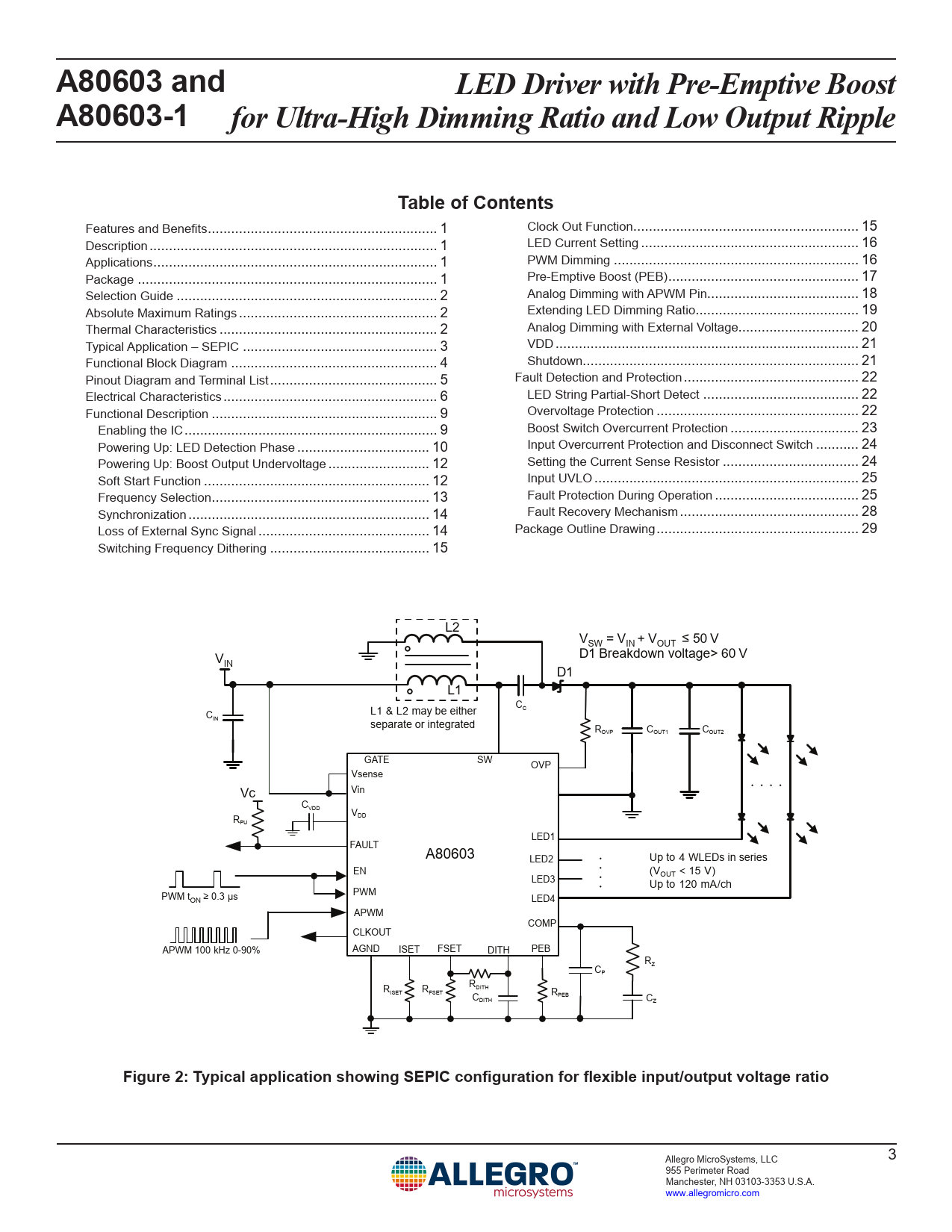 link to page 1 link to page 1 link to page 1 link to page 1 link to page 2 link to page 2 link to page 2 link to page 3 link to page 4 link to page 5 link to page 6 link to page 9 link to page 9 link to page 10 link to page 12 link to page 12 link to page 13 link to page 14 link to page 14 link to page 15 link to page 15 link to page 16 link to page 16 link to page 17 link to page 18 link to page 19 link to page 20 link to page 21 link to page 21 link to page 22 link to page 22 link to page 22 link to page 23 link to page 24 link to page 24 link to page 25 link to page 25 link to page 28 link to page 29 A80603 andLED Driver with Pre-Emptive BoostA80603-1 for Ultra-High Dimming Ratio and Low Output RippleTable of Contents Features and Benefits ... 1 Clock Out Function.. 15 Description .. 1 LED Current Setting .. 16 Applications ... 1 PWM Dimming ... 16 Package ... 1 Pre-Emptive Boost (PEB) ... 17 Selection Guide ... 2 Analog Dimming with APWM Pin... 18 Absolute Maximum Ratings ... 2 Extending LED Dimming Ratio.. 19 Thermal Characteristics .. 2 Analog Dimming with External Voltage... 20 Typical Application – SEPIC .. 3 VDD .. 21 Functional Block Diagram ... 4 Shutdown... 21 Pinout Diagram and Terminal List ... 5 Fault Detection and Protection ... 22 Electrical Characteristics ... 6 LED String Partial-Short Detect .. 22 Functional Description .. 9 Overvoltage Protection .. 22 Enabling the IC ... 9 Boost Switch Overcurrent Protection ... 23 Powering Up: LED Detection Phase .. 10 Input Overcurrent Protection and Disconnect Switch ... 24 Powering Up: Boost Output Undervoltage .. 12 Setting the Current Sense Resistor ... 24 Soft Start Function .. 12 Input UVLO .. 25 Frequency Selection .. 13 Fault Protection During Operation ... 25 Synchronization .. 14 Fault Recovery Mechanism .. 28 Loss of External Sync Signal .. 14 Package Outline Drawing .. 29 Switching Frequency Dithering ... 15 L2 VSW = VIN + VOUT ≤ 50 V V D1 Breakdown voltage > 60 V IN D1 L1 CC C L1 & L2 may be either IN separate or integrated ROVP COUT1 COUT2 GATE SW OVP Vsense Vc Vin CVDD R VDD PU VDD LED1 FAULT A80603 LED2 Up to 4 WLEDs in series EN (VOUT < 15 V) LED3 Up to 120 mA/ch PWM t PWM ON ≥ 0.3 µs LED4 APWM COMP CLKOUT APWM 100 kHz 0-90% AGND ISET FSET DITH PEB R C Z P R RDITH ISET RFSET C RPEB DITH CZ Figure 2: Typical application showing SEPIC configuration for flexible input/output voltage ratio Allegro MicroSystems, LLC 3 955 Perimeter Road Manchester, NH 03103-3353 U.S.A. www.allegromicro.com Document Outline Features and Benefits Description Applications Package Selection Guide Absolute Maximum Ratings Thermal Characteristics Typical Application – SEPIC Functional Block Diagram Pinout Diagram and Terminal List Electrical Characteristics Functional Description Enabling the IC Powering Up: LED Detection Phase Powering Up: Boost Output Undervoltage Soft Start Function Frequency Selection Synchronization Loss of External Sync Signal Switching Frequency Dithering Clock Out Function LED Current Setting PWM Dimming Pre-Emptive Boost (PEB) Analog Dimming with APWM Pin Extending LED Dimming Ratio Analog Dimming with External Voltage VDD Shutdown Fault Detection and Protection LED String Partial-Short Detect Overvoltage Protection Boost Switch Overcurrent Protection Input Overcurrent Protection and Disconnect Switch Setting the Current Sense Resistor Input UVLO Fault Protection During Operation Fault Recovery Mechanism Package Outline Drawing