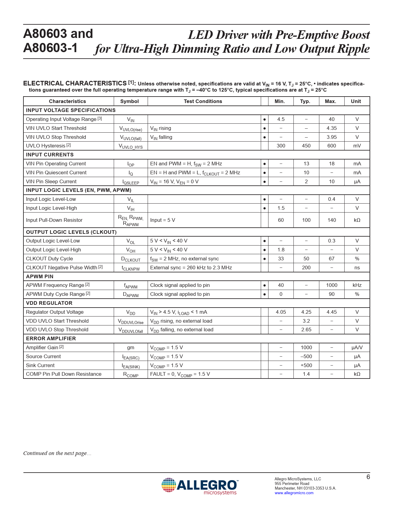 A80603 and LED Driver with Pre-Emptive Boost A80603-1 for Ultra-High Dimming Ratio and Low Output Ripple ELECTRICAL CHARACTERISTICS [1]: Unless otherwise noted, specifications are valid at VIN = 16 V, TJ = 25°C, • indicates specifica- tions guaranteed over the full operating temperature range with TJ = –40°C to 125°C, typical specifications are at TJ = 25°C Characteristics Symbol Test Conditions Min. Typ. Max. Unit INPUT VOLTAGE SPECIFICATIONS