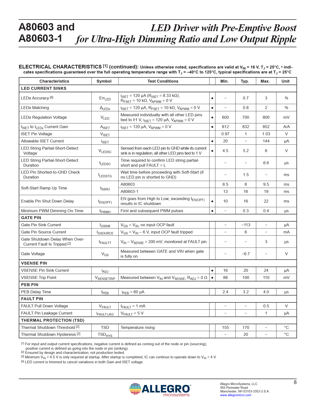 A80603 andLED Driver with Pre-Emptive BoostA80603-1 for Ultra-High Dimming Ratio and Low Output RippleELECTRICAL CHARACTERISTICS [1] (continued): Unless otherwise noted, specifications are valid at VIN = 16 V, TJ = 25°C, • indi-cates specifications guaranteed over the full operating temperature range with TJ = –40°C to 125°C, typical specifications are at TJ = 25°CCharacteristicsSymbolTest ConditionsMin.Typ.Max.UnitLED CURRENT SINKS LEDx Accuracy [4] Err iISET = 120 µA (RISET = 8.33 kΩ), LED RFSET = 10 kΩ, VAPWM = 0 V ● − 0.7 3 % LEDx Matching ΔLEDx iISET = 120 µA, RFSET = 10 kΩ, VAPWM = 0 V ● − 0.8 2 % LEDx Regulation Voltage V Measured individually with all other LED pins LED tied to ≥1 V, iISET = 120 µA, VAPWM = 0 V ● 600 700 800 mV IISET to ILEDx Current Gain AISET iISET = 120 µA, VAPWM = 0 V ● 812 832 852 A/A ISET Pin Voltage VISET 0.97 1 1.03 V Allowable ISET Current iISET ● 20 − 144 µA LED String Partial-Short-Detect Sensed from each LED pin to GND while its current Voltage VLEDSC sink is in regulation; all other LED pins tied to 1 V ● 4.5 5.2 6 V LED String Partial-Short-Detect Time required to confirm LED string partial- Duration tLEDSC short and pull FAULT = L − − 6.6 µs LED Pin Shorted-to-GND Check Wait time before proceeding with Soft-Start (if Duration tLEDSTG no LED pin is shorted to GND) − 1.5 − ms A80603 6.5 8 9.5 ms Soft-Start Ramp Up Time tSSRU A80603-1 13 16 19 ms Enable Pin Shut Down Delay t EN goes from High to Low; exceeding tEN(OFF) EN(OFF) results in IC shutdown ● 10 16 22 ms Minimum PWM Dimming On-Time tPWMH First and subsequent PWM pulses ● − 0.3 0.4 µs GATE PIN Gate Pin Sink Current IGSINK VGS = VIN, no input OCP fault − −113 − µA Gate Pin Source Current IGSOURCE VGS = VIN – 6 V, input OCP fault tripped − 6 − mA Gate Shutdown Delay When Over- Current Fault Is Tripped [2] tFAULTT VIN – VSENSE = 200 mV; monitored at FAULT pin − − 3 µs Gate Voltage V Measured between GATE and VIN when gate GS is fully on − −6.7 − V VSENSE PIN VSENSE Pin Sink Current iADJ ● 16 20 24 µA VSENSE Trip Point VSENSETRIP Measured between VIN and VSENSE, RADJ = 0 Ω ● 88 100 110 mV PEB PIN PEB Delay Time tPEB iPEB = 60 µA 2.4 3.2 4.0 µs FAULT PIN FAULT Pull Down Voltage VFAULT IFAULT = 1 mA − − 0.5 V FAULT Pin Leakage Current iFAULT-LKG VFAULT = 5 V − − 1 µA THERMAL PROTECTION (TSD) Thermal Shutdown Threshold [2] TSD Temperature rising 155 170 − °C Thermal Shutdown Hysteresis [2] TSDHYS − 20 − °C [1] For input and output current specifications, negative current is defined as coming out of the node or pin (sourcing); positive current is defined as going into the node or pin (sinking). [2] Ensured by design and characterization; not production tested. [3] Minimum VIN = 4.5 V is only required at startup. After startup is completed, IC can continue to operate down to VIN = 4 V. [4] LED current is trimmed to cancel variations in both Gain and ISET voltage. Allegro MicroSystems, LLC 8 955 Perimeter Road Manchester, NH 03103-3353 U.S.A. www.allegromicro.com Document Outline Features and Benefits Description Applications Package Selection Guide Absolute Maximum Ratings Thermal Characteristics Typical Application – SEPIC Functional Block Diagram Pinout Diagram and Terminal List Electrical Characteristics Functional Description Enabling the IC Powering Up: LED Detection Phase Powering Up: Boost Output Undervoltage Soft Start Function Frequency Selection Synchronization Loss of External Sync Signal Switching Frequency Dithering Clock Out Function LED Current Setting PWM Dimming Pre-Emptive Boost (PEB) Analog Dimming with APWM Pin Extending LED Dimming Ratio Analog Dimming with External Voltage VDD Shutdown Fault Detection and Protection LED String Partial-Short Detect Overvoltage Protection Boost Switch Overcurrent Protection Input Overcurrent Protection and Disconnect Switch Setting the Current Sense Resistor Input UVLO Fault Protection During Operation Fault Recovery Mechanism Package Outline Drawing