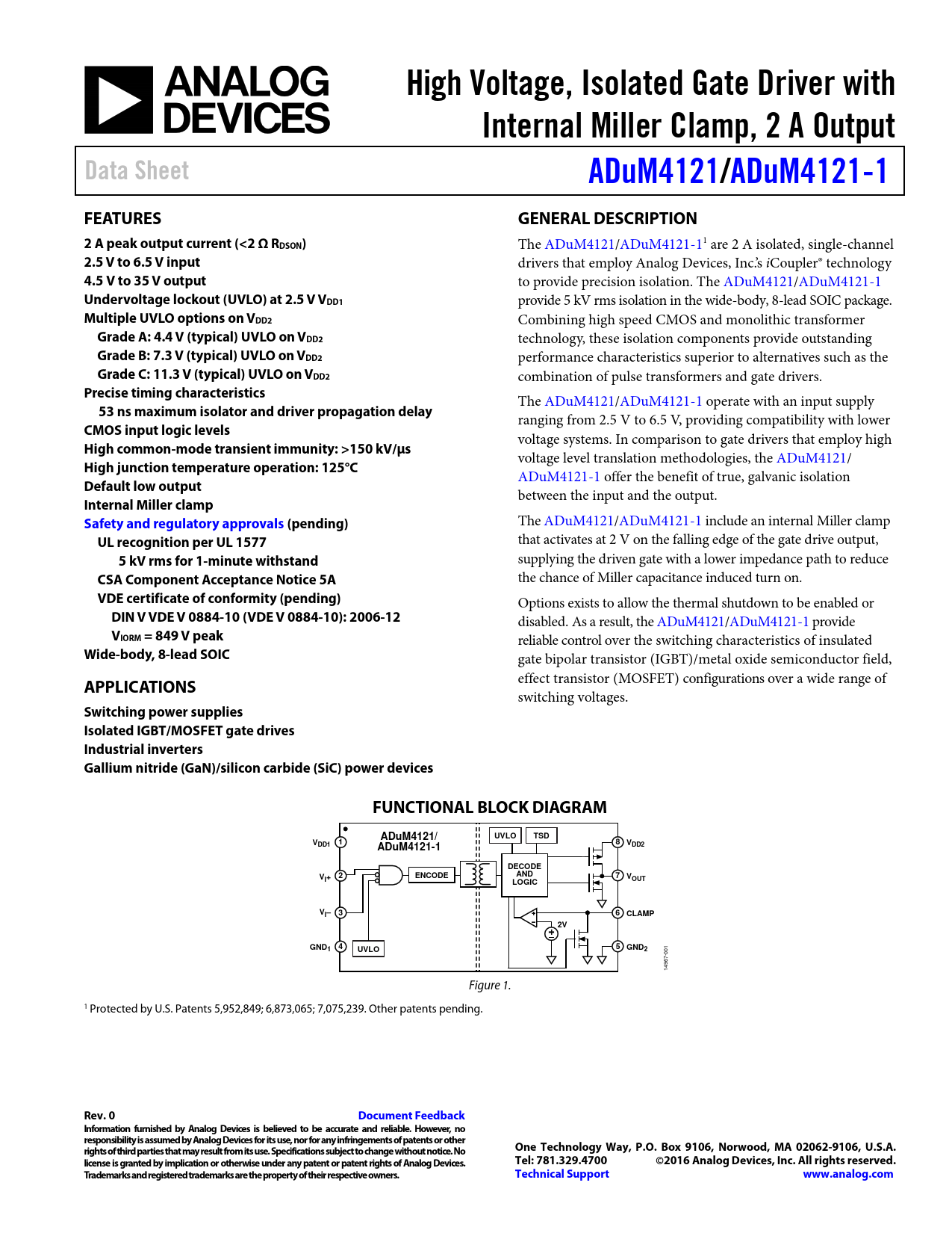 High Voltage, Isolated Gate Driver with. Internal Mil er Clamp, 2 A Output. Data Sheet. ADuM4121/. ADuM4121-1. FEATURES