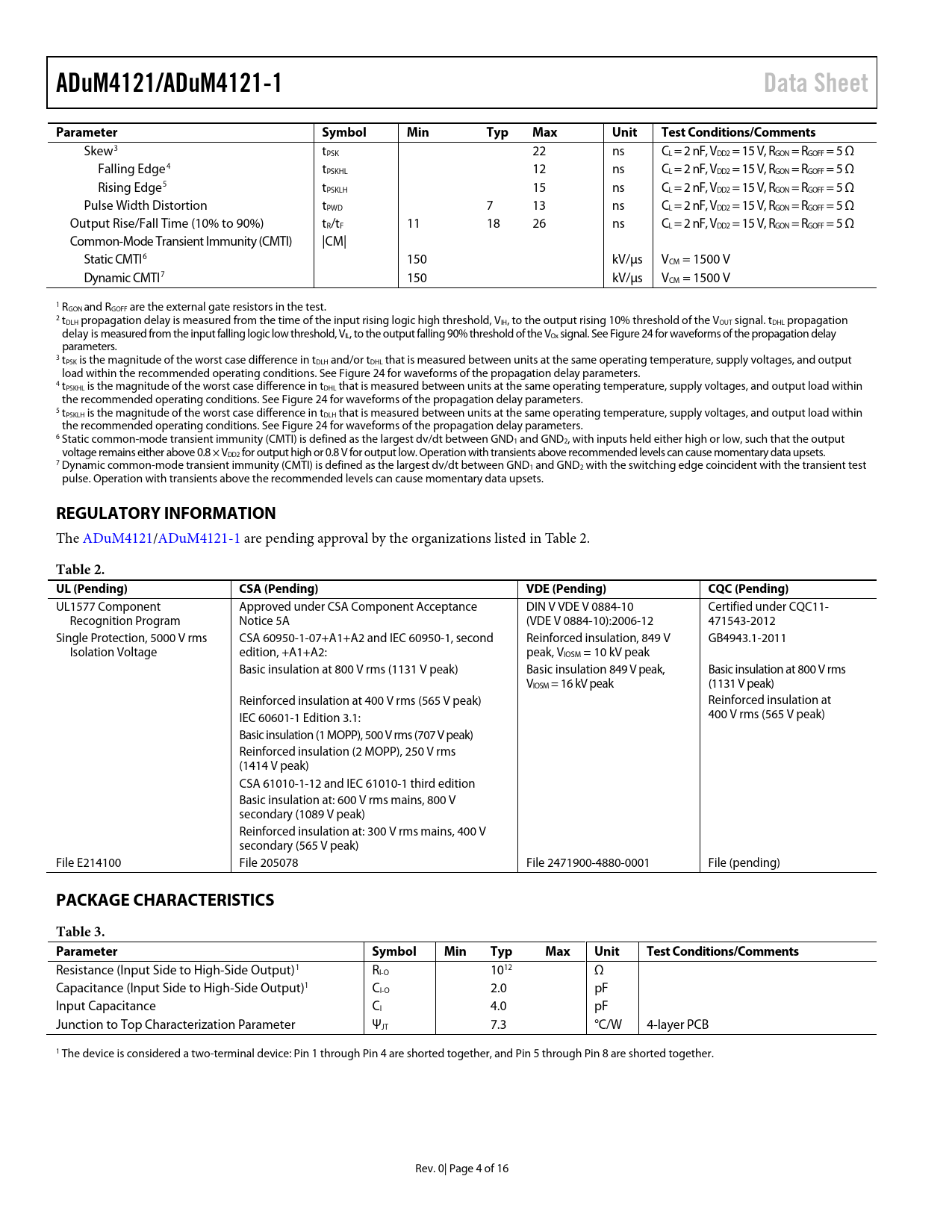 ADuM4121/ADuM4121-1. Data Sheet. Parameter. Symbol. Min. Typ. Max. Unit. Test Conditions/Comments. REGULATORY INFORMATION