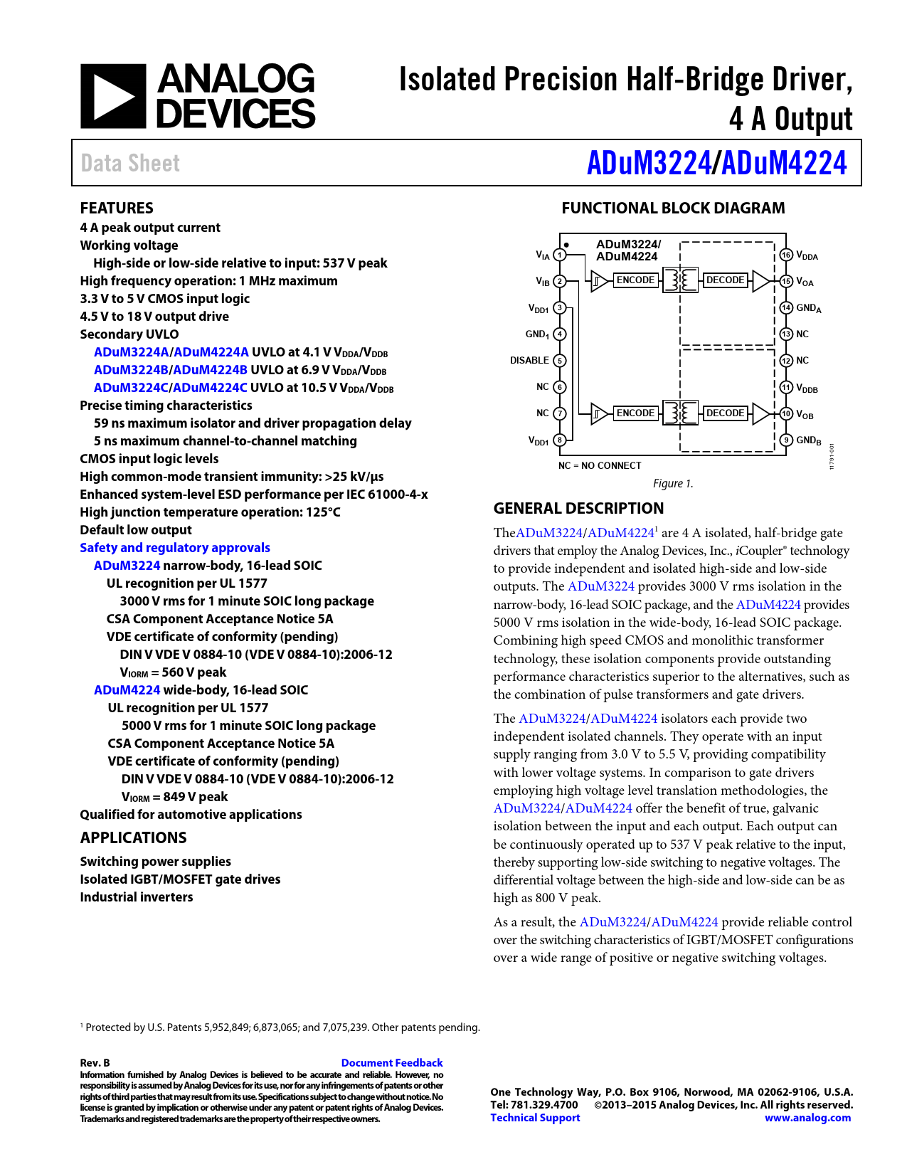 Isolated Precision Half-Bridge Driver,. 4 A Output. Data Sheet. ADuM3224/. ADuM4224. FEATURES. FUNCTIONAL BLOCK DIAGRAM