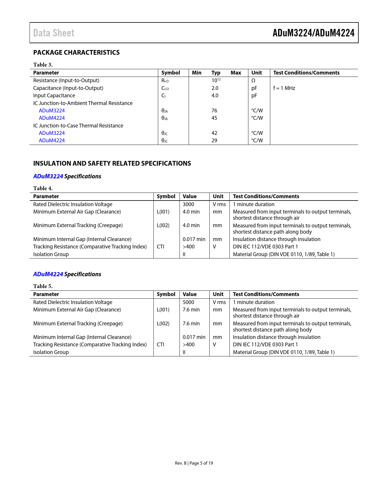 Data Sheet ADuM3224/ADuM4224 PACKAGE CHARACTERISTICS Table 3 Parameter Symbol Min Typ Max Unit Test Conditions/Comments
