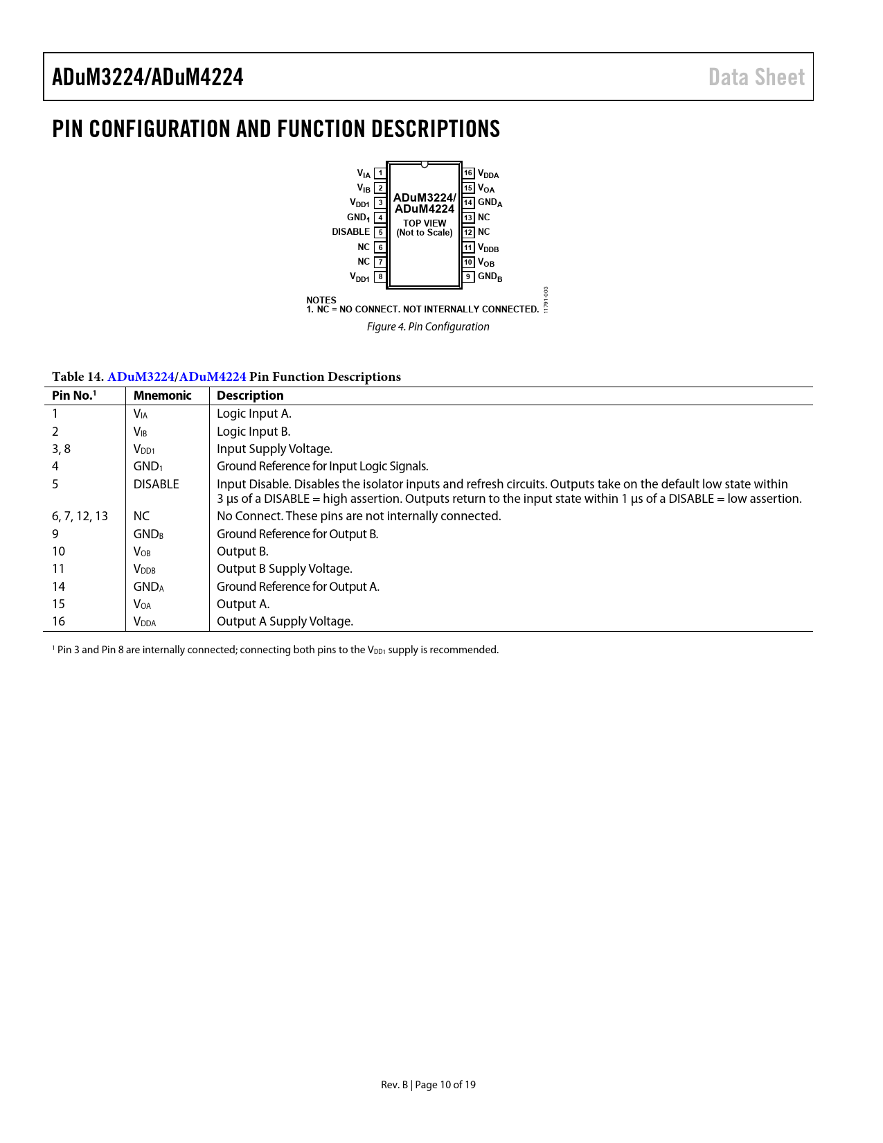 Seiten / Seite19 / 10 — ADuM3224/ADuM4224. Data Sheet. PIN CONFIGURATION AND FUNCTION …