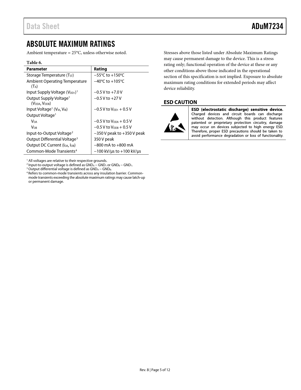 link to page 5 link to page 5 link to page 5 link to page 5 link to page 5 Data SheetADuM7234ABSOLUTE MAXIMUM RATINGS Ambient temperature = 25°C, unless otherwise noted. Stresses above those listed under Absolute Maximum Ratings may cause permanent damage to the device. This is a stress Table 6. rating only; functional operation of the device at these or any ParameterRating other conditions above those indicated in the operational Storage Temperature (TST) −55°C to +150°C section of this specification is not implied. Exposure to absolute Ambient Operating Temperature −40°C to +105°C maximum rating conditions for extended periods may affect (TA) device reliability. Input Supply Voltage (VDD1)1 −0.5 V to +7.0 V Output Supply Voltage1 −0.5 V to +27 V (V ESD CAUTION DDA, VDDB) Input Voltage1 (VIA, VIB) −0.5 V to VDD1 + 0.5 V Output Voltage1 VOA −0.5 V to VDDA + 0.5 V VOB −0.5 V to VDDB + 0.5 V Input-to-Output Voltage2 −350 V peak to +350 V peak Output Differential Voltage3 350 V peak Output DC Current (IOA, IOB) −800 mA to +800 mA Common-Mode Transients4 −100 kV/µs to +100 kV/µs 1 All voltages are relative to their respective grounds. 2 Input-to-output voltage is defined as GNDA − GND1 or GNDB − GND1. 3 Output differential voltage is defined as GNDA − GNDB. 4 Refers to common-mode transients across any insulation barrier. Common- mode transients exceeding the absolute maximum ratings may cause latch-up or permanent damage. Rev. B | Page 5 of 12 Document Outline Features Applications General Description Functional Block Diagram Table of Contents Revision History Specifications Electrical Characteristics Package Characteristics Insulation and Safety-Related Specifications Recommended Operating Conditions Regulatory Information Absolute Maximum Ratings ESD Caution Pin Configuration and Function Descriptions Typical Performance Characteristics Applications Information Common-Mode Transient Immunity Insulation Lifetime Outline Dimensions Ordering Guide