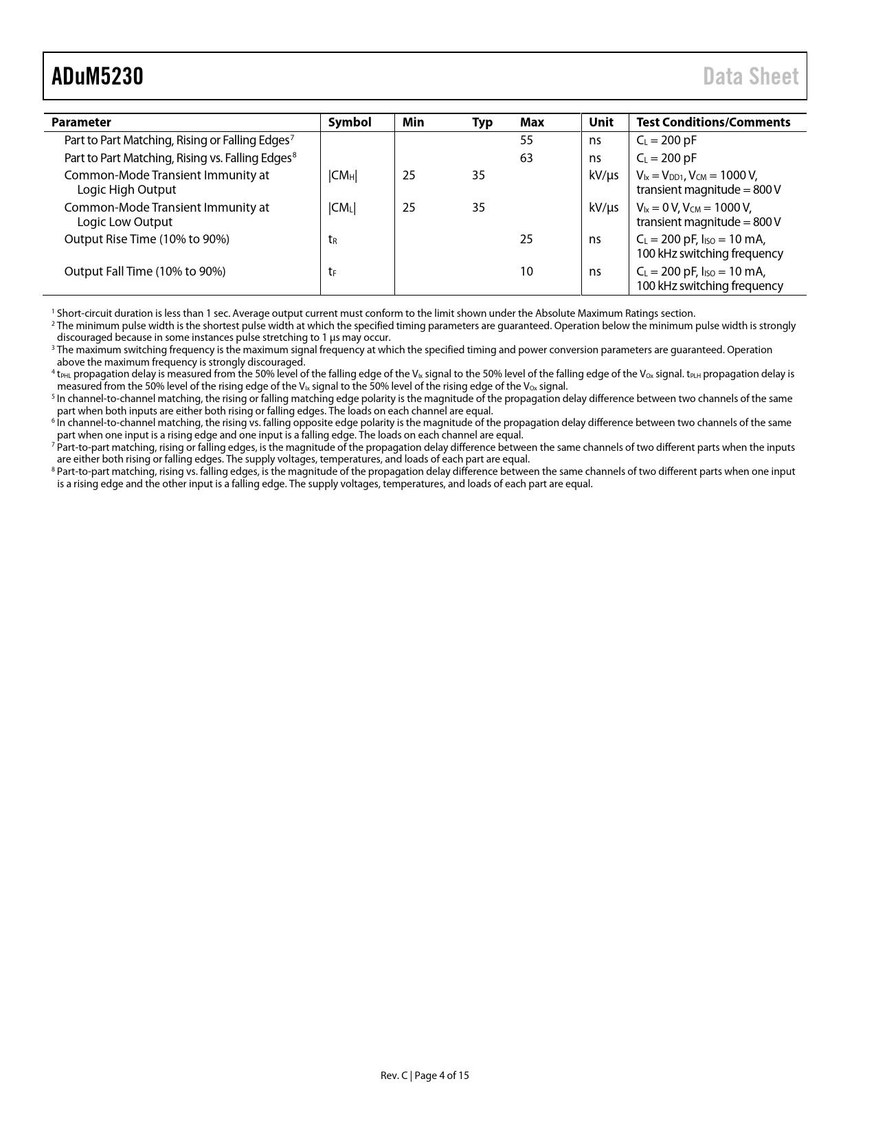 link to page 6 ADuM5230Data SheetParameterSymbolMinTypMaxUnitTest Conditions/Comments Part to Part Matching, Rising or Fal ing Edges7 55 ns CL = 200 pF Part to Part Matching, Rising vs. Falling Edges8 63 ns CL = 200 pF Common-Mode Transient Immunity at |CMH| 25 35 kV/µs VIx = VDD1, VCM = 1000 V, Logic High Output transient magnitude = 800 V Common-Mode Transient Immunity at |CML| 25 35 kV/µs VIx = 0 V, VCM = 1000 V, Logic Low Output transient magnitude = 800 V Output Rise Time (10% to 90%) tR 25 ns CL = 200 pF, IISO = 10 mA, 100 kHz switching frequency Output Fall Time (10% to 90%) tF 10 ns CL = 200 pF, IISO = 10 mA, 100 kHz switching frequency 1 Short-circuit duration is less than 1 sec. Average output current must conform to the limit shown under the Absolute Maximum Ratings section. 2 The minimum pulse width is the shortest pulse width at which the specified timing parameters are guaranteed. Operation below the minimum pulse width is strongly discouraged because in some instances pulse stretching to 1 µs may occur. 3 The maximum switching frequency is the maximum signal frequency at which the specified timing and power conversion parameters are guaranteed. Operation above the maximum frequency is strongly discouraged. 4 tPHL propagation delay is measured from the 50% level of the falling edge of the VIx signal to the 50% level of the falling edge of the VOx signal. tPLH propagation delay is measured from the 50% level of the rising edge of the VIx signal to the 50% level of the rising edge of the VOx signal. 5 In channel-to-channel matching, the rising or falling matching edge polarity is the magnitude of the propagation delay difference between two channels of the same part when both inputs are either both rising or falling edges. The loads on each channel are equal. 6 In channel-to-channel matching, the rising vs. falling opposite edge polarity is the magnitude of the propagation delay difference between two channels of the same part when one input is a rising edge and one input is a falling edge. The loads on each channel are equal. 7 Part-to-part matching, rising or falling edges, is the magnitude of the propagation delay difference between the same channels of two different parts when the inputs are either both rising or falling edges. The supply voltages, temperatures, and loads of each part are equal. 8 Part-to-part matching, rising vs. falling edges, is the magnitude of the propagation delay difference between the same channels of two different parts when one input is a rising edge and the other input is a falling edge. The supply voltages, temperatures, and loads of each part are equal. Rev. C | Page 4 of 15 Document Outline FEATURES APPLICATIONS FUNCTIONAL BLOCK DIAGRAM GENERAL DESCRIPTION TABLE OF CONTENTS REVISION HISTORY SPECIFICATIONS ELECTRICAL CHARACTERISTICS PACKAGE CHARACTERISTICS REGULATORY INFORMATION INSULATION AND SAFETY-RELATED SPECIFICATIONS RECOMMENDED OPERATING CONDITIONS ABSOLUTE MAXIMUM RATINGS ESD CAUTION PIN CONFIGURATION AND FUNCTION DESCRIPTIONS TYPICAL PERFOMANCE CHARACTERISTICS APPLICATIONS INFORMATION THEORY OF OPERATION PRINTED CIRCUIT BOARD (PCB) LAYOUT THERMAL ANALYSIS PROPAGATION DELAY-RELATED PARAMETERS DC CORRECTNESS AND MAGNETIC FIELD IMMUNITY POWER CONSUMPTION INCREASING AND DECREASING AVAILABLE POWER COMMON-MODE TRANSIENT IMMUNITY TYPICAL APPLICATION USAGE INSULATION LIFETIME OUTLINE DIMENSIONS ORDERING GUIDE AUTOMOTIVE PRODUCTS