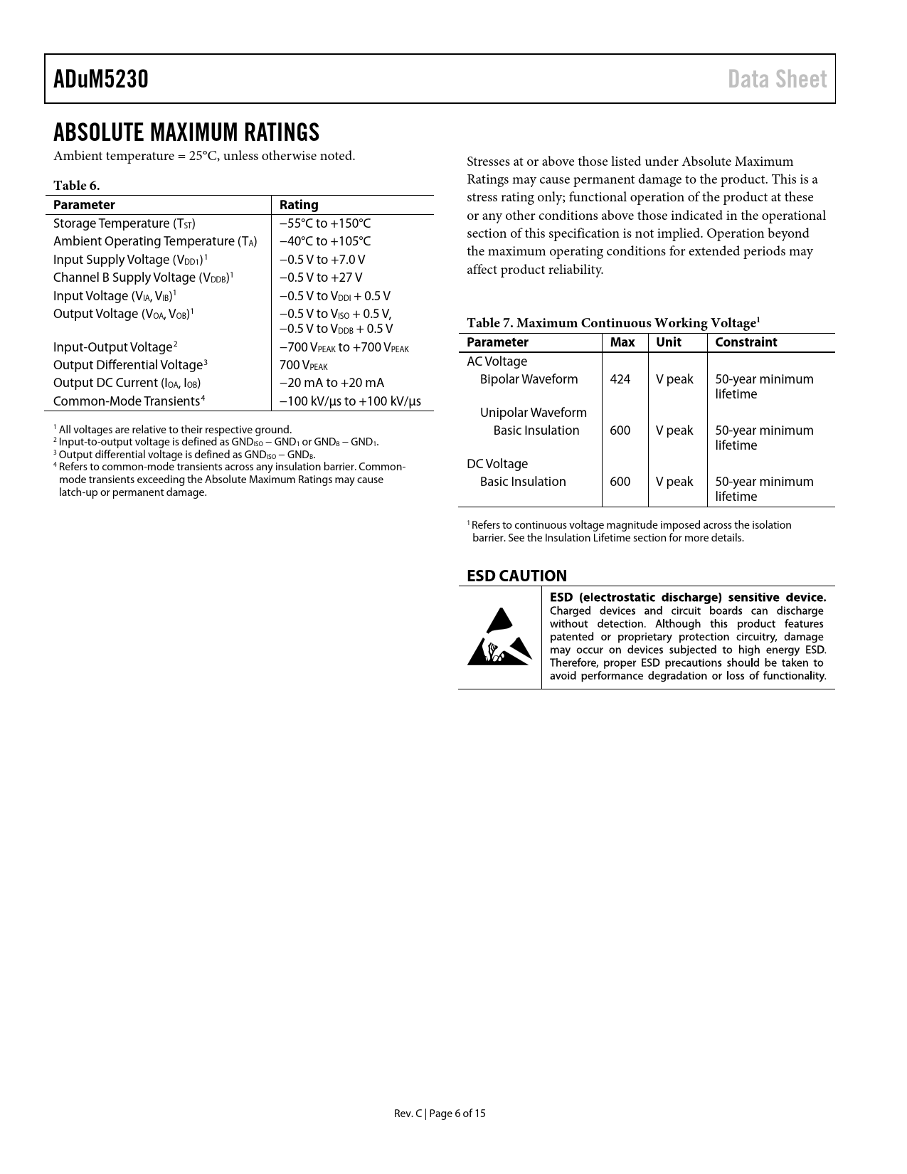 link to page 14 ADuM5230Data SheetABSOLUTE MAXIMUM RATINGS Ambient temperature = 25°C, unless otherwise noted. Stresses at or above those listed under Absolute Maximum Table 6. Ratings may cause permanent damage to the product. This is a ParameterRating stress rating only; functional operation of the product at these or any other conditions above those indicated in the operational Storage Temperature (TST) −55°C to +150°C section of this specification is not implied. Operation beyond Ambient Operating Temperature (TA) −40°C to +105°C the maximum operating conditions for extended periods may Input Supply Voltage (VDD1)1 −0.5 V to +7.0 V affect product reliability. Channel B Supply Voltage (VDDB)1 −0.5 V to +27 V Input Voltage (VIA, VIB)1 −0.5 V to VDDI + 0.5 V Output Voltage (VOA, VOB)1 −0.5 V to VISO + 0.5 V, −0.5 V to V Table 7. Maximum Continuous Working Voltage1 DDB + 0.5 V Input-Output Voltage2 −700 V ParameterMaxUnitConstraint PEAK to +700 VPEAK Output Differential Voltage3 700 V AC Voltage PEAK Output DC Current (I Bipolar Waveform 424 V peak OA, IOB) −20 mA to +20 mA 50-year minimum Common-Mode Transients4 −100 kV/µs to +100 kV/µs lifetime Unipolar Waveform 1 All voltages are relative to their respective ground. Basic Insulation 600 V peak 50-year minimum 2 Input-to-output voltage is defined as GNDISO − GND1 or GNDB − GND1. lifetime 3 Output differential voltage is defined as GNDISO − GNDB. 4 Refers to common-mode transients across any insulation barrier. Common- DC Voltage mode transients exceeding the Absolute Maximum Ratings may cause Basic Insulation 600 V peak 50-year minimum latch-up or permanent damage. lifetime 1 Refers to continuous voltage magnitude imposed across the isolation barrier. See the Insulation Lifetime section for more details. ESD CAUTION Rev. C | Page 6 of 15 Document Outline FEATURES APPLICATIONS FUNCTIONAL BLOCK DIAGRAM GENERAL DESCRIPTION TABLE OF CONTENTS REVISION HISTORY SPECIFICATIONS ELECTRICAL CHARACTERISTICS PACKAGE CHARACTERISTICS REGULATORY INFORMATION INSULATION AND SAFETY-RELATED SPECIFICATIONS RECOMMENDED OPERATING CONDITIONS ABSOLUTE MAXIMUM RATINGS ESD CAUTION PIN CONFIGURATION AND FUNCTION DESCRIPTIONS TYPICAL PERFOMANCE CHARACTERISTICS APPLICATIONS INFORMATION THEORY OF OPERATION PRINTED CIRCUIT BOARD (PCB) LAYOUT THERMAL ANALYSIS PROPAGATION DELAY-RELATED PARAMETERS DC CORRECTNESS AND MAGNETIC FIELD IMMUNITY POWER CONSUMPTION INCREASING AND DECREASING AVAILABLE POWER COMMON-MODE TRANSIENT IMMUNITY TYPICAL APPLICATION USAGE INSULATION LIFETIME OUTLINE DIMENSIONS ORDERING GUIDE AUTOMOTIVE PRODUCTS