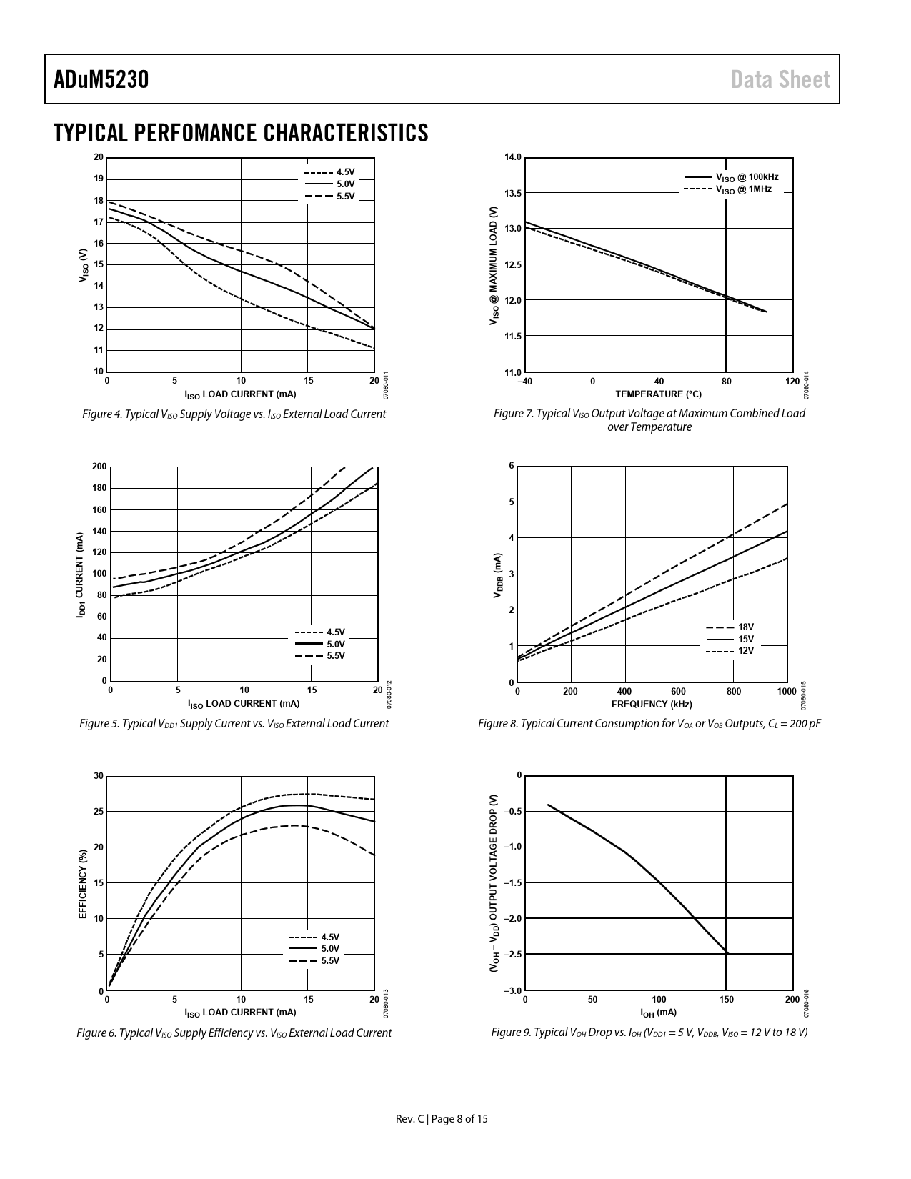 ADuM5230. Data Sheet. TYPICAL PERFOMANCE CHARACTERISTICS. 14.0. 4.5V. 5.0V. ISO @ 100kHz. 13.5. VISO @ 1MHz. 5.5V. (V D A 13.0. M LO. (V 15. 12.5