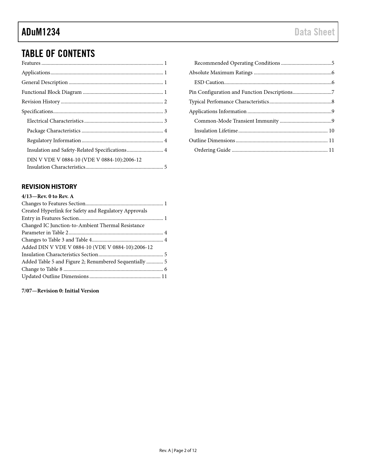 Seiten / Seite12 / 2 — ADuM1234. Data Sheet. TABLE OF CONTENTS. REVISION HISTORY 4/13—Rev. 0 to …