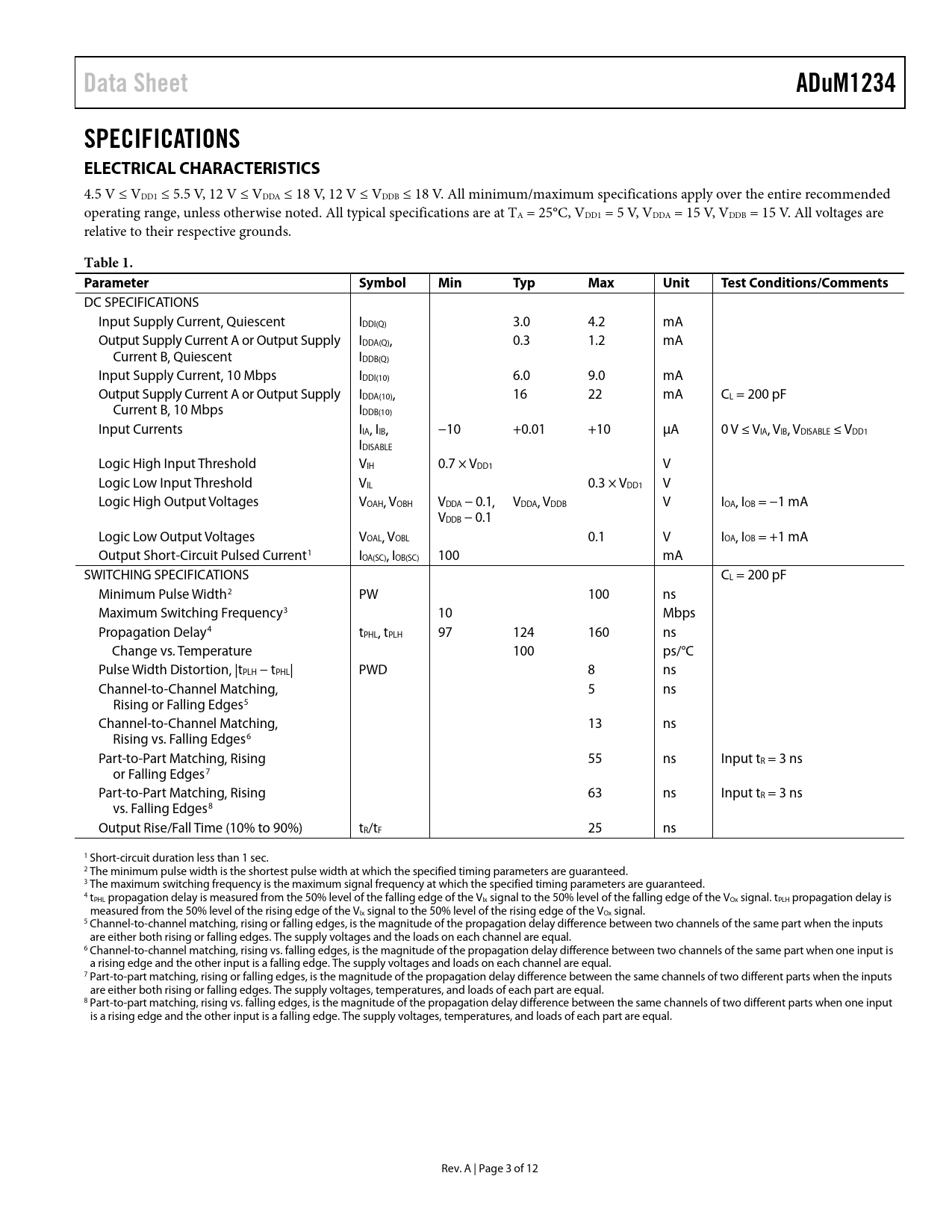 Seiten / Seite12 / 3 — Data Sheet. ADuM1234. SPECIFICATIONS ELECTRICAL CHARACTERISTICS. Table 1. …