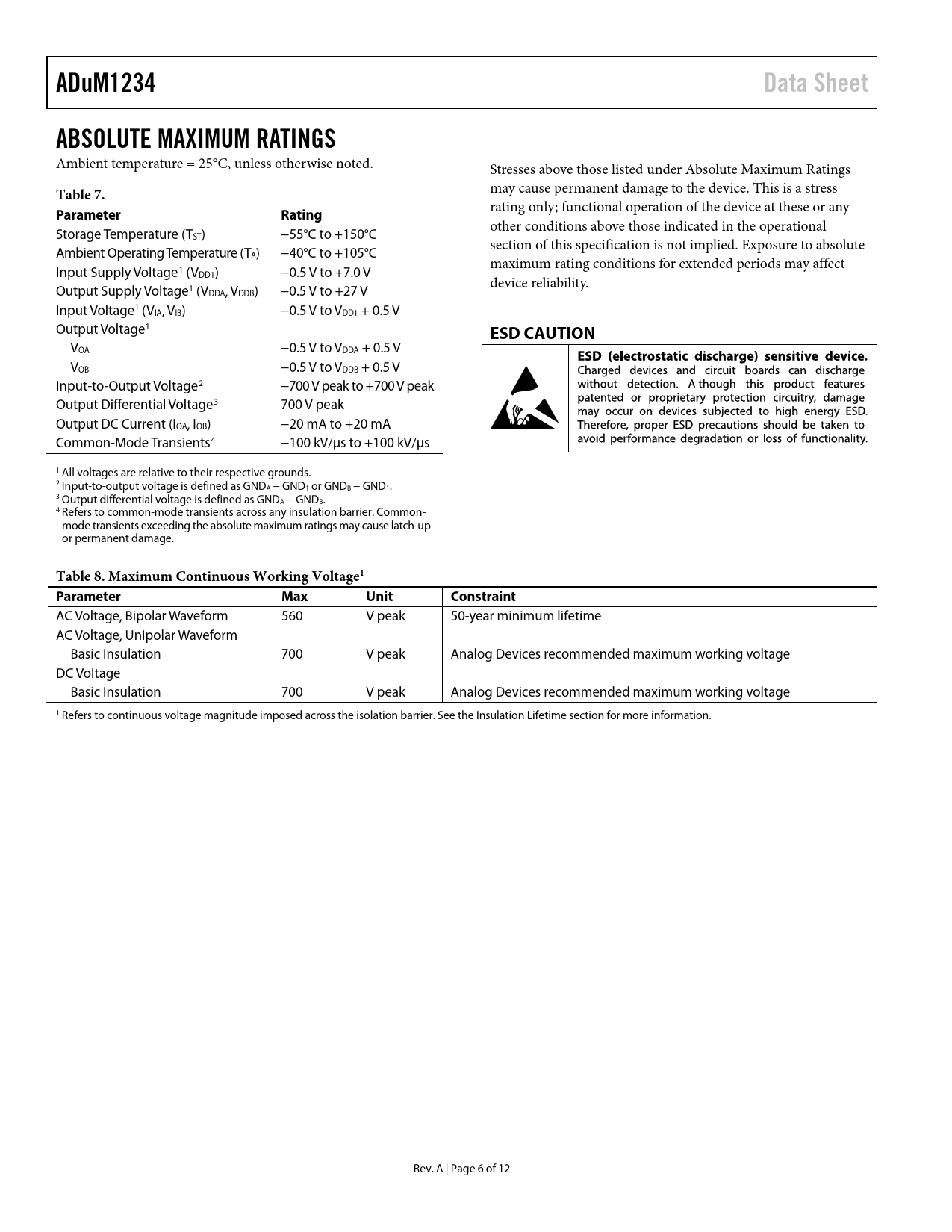 ADuM1234. Data Sheet. ABSOLUTE MAXIMUM RATINGS. Table 7. Parameter. Rating. ESD CAUTION. Table 8. Maximum Continuous Working Voltage1