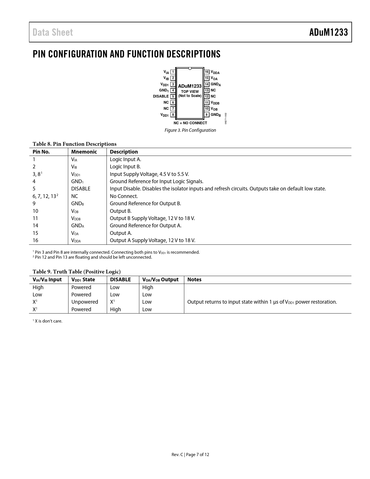 1 VIA Logic Input A. 2 VIB Logic Input B. 3, 81 VDD1 Input Supply Voltage, 4.5 V to 5.5 V. 4 GND1 Ground Reference for Input Logic Signals. 5 DISABLE Input Disable. Disables the isolator inputs and refresh circuits. Outputs take on default low state. 6, 7, 12, 132 NC No Connect. 9 GNDB Ground Reference for Output B. 10 VOB Output B. 11 VDDB Output B Supply Voltage, 12 V to 18 V. 14 GNDA Ground Reference for Output A. 15 VOA Output A. 16 VDDA Output A Supply Voltage, 12 V to 18 V. 1 Pin 3 and Pin 8 are internally connected. Connecting both pins to VDD1 is recommended. 2 Pin 12 and Pin 13 are floating and should be left unconnected.
