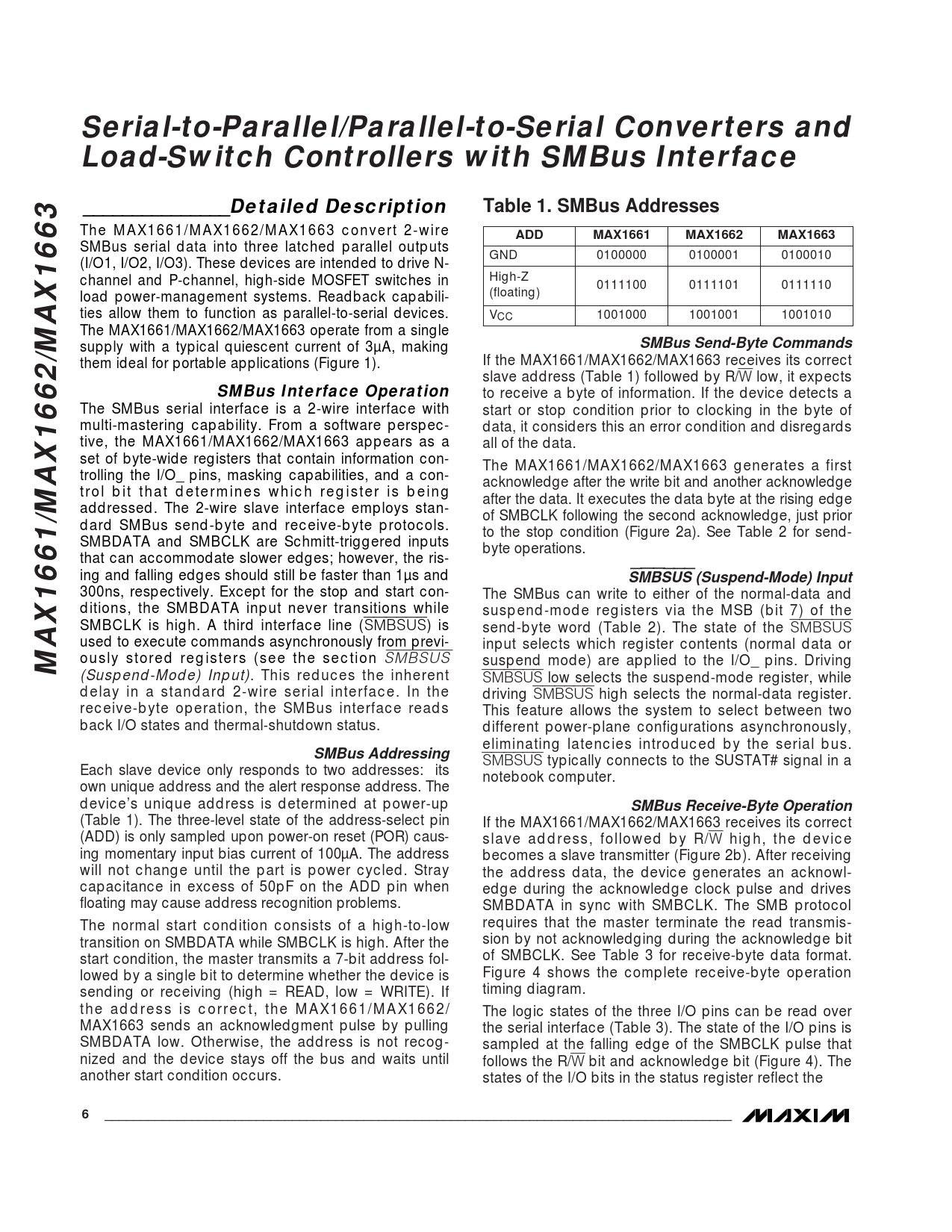 Serial-to-Parallel/Parallel-to-Serial Converters and Load-Switch Controllers with SMBus Interface_______________Detailed DescriptionTable 1. SMBus Addresses The MAX1661/MAX1662/MAX1663 convert 2-wire ADDMAX1661MAX1662MAX1663 SMBus serial data into three latched parallel outputs GND 0100000 0100001 0100010 (I/O1, I/O2, I/O3). These devices are intended to drive N- channel and P-channel, high-side MOSFET switches in High-Z 0111100 0111101 0111110 load power-management systems. Readback capabili- (floating) ties allow them to function as parallel-to-serial devices. VCC 1001000 1001001 1001010 The MAX1661/MAX1662/MAX1663 operate from a single supply with a typical quiescent current of 3µA, making SMBus Send-Byte Commands them ideal for portable applications (Figure 1). If the MAX1661/MAX1662/MAX1663 receives its correct slave address (Table 1) followed by R/W low, it expects SMBus Interface Operation to receive a byte of information. If the device detects a The SMBus serial interface is a 2-wire interface with start or stop condition prior to clocking in the byte of multi-mastering capability. From a software perspec- data, it considers this an error condition and disregards tive, the MAX1661/MAX1662/MAX1663 appears as a all of the data. set of byte-wide registers that contain information con- The MAX1661/MAX1662/MAX1663 generates a first trolling the I/O_ pins, masking capabilities, and a con- acknowledge after the write bit and another acknowledge trol bit that determines which register is being after the data. It executes the data byte at the rising edge addressed. The 2-wire slave interface employs stan- of SMBCLK following the second acknowledge, just prior dard SMBus send-byte and receive-byte protocols. to the stop condition (Figure 2a). See Table 2 for send- SMBDATA and SMBCLK are Schmitt-triggered inputs byte operations. that can accommodate slower edges; however, the ris- ing and falling edges should still be faster than 1µs and SMBSUS (Suspend-Mode) Input 300ns, respectively. Except for the stop and start con- The SMBus can write to either of the normal-data and ditions, the SMBDATA input never transitions while suspend-mode registers via the MSB (bit 7) of the SMBCLK is high. A third interface line (SMBSUS) is send-byte word (Table 2). The state of the SMBSUS used to execute commands asynchronously from previ- input selects which register contents (normal data or ously stored registers (see the section SMBSUS suspend mode) are applied to the I/O_ pins. Driving MAX1661/MAX1662/MAX1663 (Suspend-Mode) Input). This reduces the inherent SMBSUS low selects the suspend-mode register, while delay in a standard 2-wire serial interface. In the driving SMBSUS high selects the normal-data register. receive-byte operation, the SMBus interface reads This feature allows the system to select between two back I/O states and thermal-shutdown status. different power-plane configurations asynchronously, eliminating latencies introduced by the serial bus. SMBus Addressing SMBSUS typically connects to the SUSTAT# signal in a Each slave device only responds to two addresses: its notebook computer. own unique address and the alert response address. The device’s unique address is determined at power-up SMBus Receive-Byte Operation (Table 1). The three-level state of the address-select pin If the MAX1661/MAX1662/MAX1663 receives its correct (ADD) is only sampled upon power-on reset (POR) caus- slave address, followed by R/W high, the device ing momentary input bias current of 100µA. The address becomes a slave transmitter (Figure 2b). After receiving will not change until the part is power cycled. Stray the address data, the device generates an acknowl- capacitance in excess of 50pF on the ADD pin when edge during the acknowledge clock pulse and drives floating may cause address recognition problems. SMBDATA in sync with SMBCLK. The SMB protocol The normal start condition consists of a high-to-low requires that the master terminate the read transmis- transition on SMBDATA while SMBCLK is high. After the sion by not acknowledging during the acknowledge bit start condition, the master transmits a 7-bit address fol- of SMBCLK. See Table 3 for receive-byte data format. lowed by a single bit to determine whether the device is Figure 4 shows the complete receive-byte operation sending or receiving (high = READ, low = WRITE). If timing diagram. the address is correct, the MAX1661/MAX1662/ The logic states of the three I/O pins can be read over MAX1663 sends an acknowledgment pulse by pulling the serial interface (Table 3). The state of the I/O pins is SMBDATA low. Otherwise, the address is not recog- sampled at the falling edge of the SMBCLK pulse that nized and the device stays off the bus and waits until follows the R/W bit and acknowledge bit (Figure 4). The another start condition occurs. states of the I/O bits in the status register reflect the 6_______________________________________________________________________________________