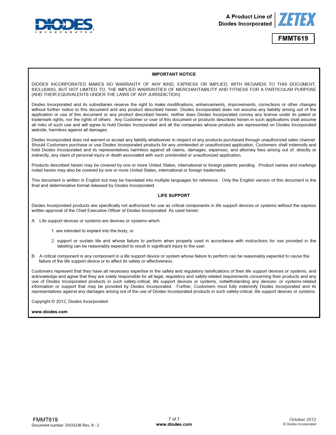 | Seiten / Seite | 7 / 7 — A Product Line of. Diodes Incorporated. FMMT619. IMPORTANT NOTICE. LIFE … |