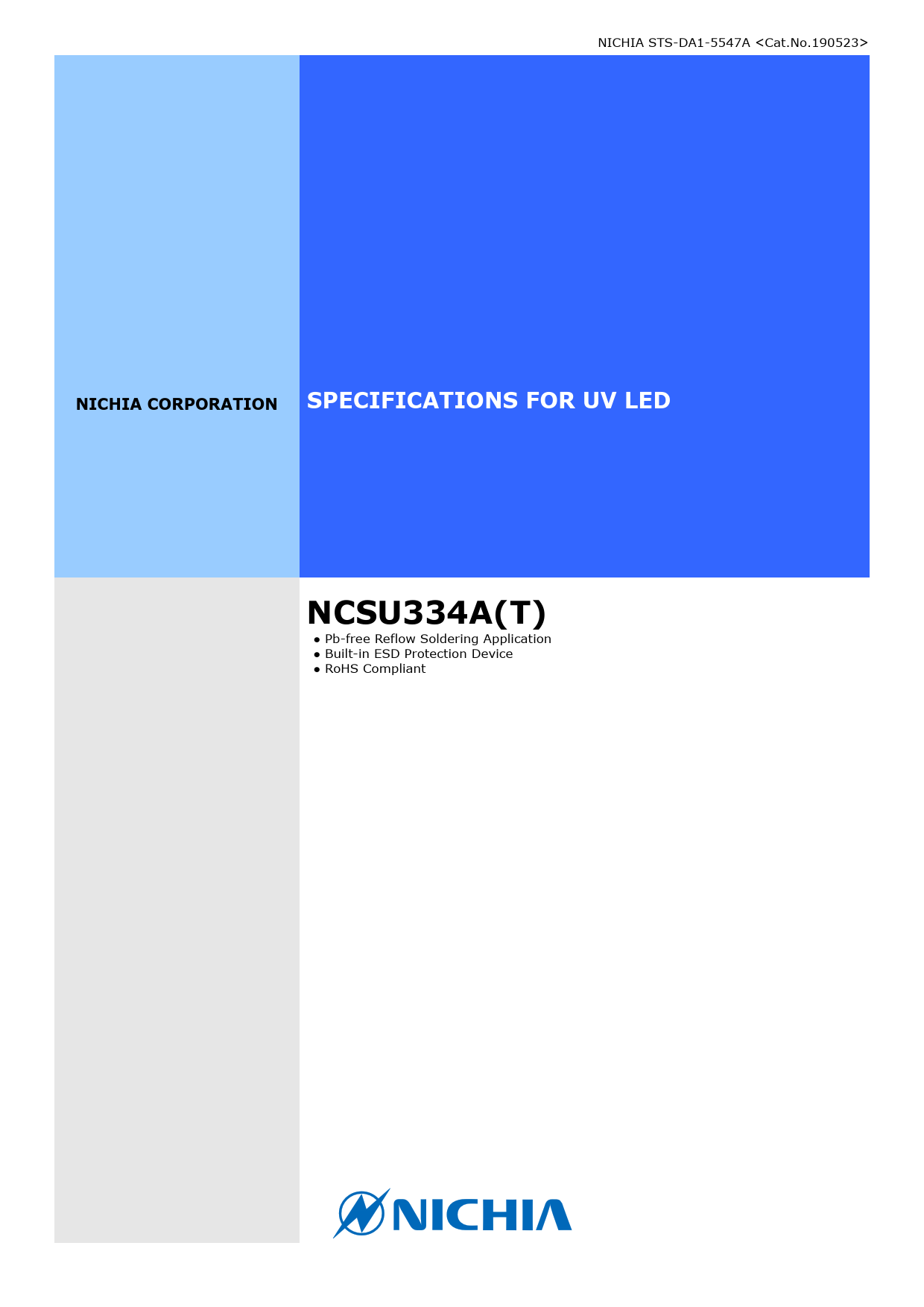 NICHIA STS-DA1-5547A NICHIA CORPORATION SPECIFICATIONS FOR UV LED NCSU334A(T). ● Pb-free Reflow Soldering Application