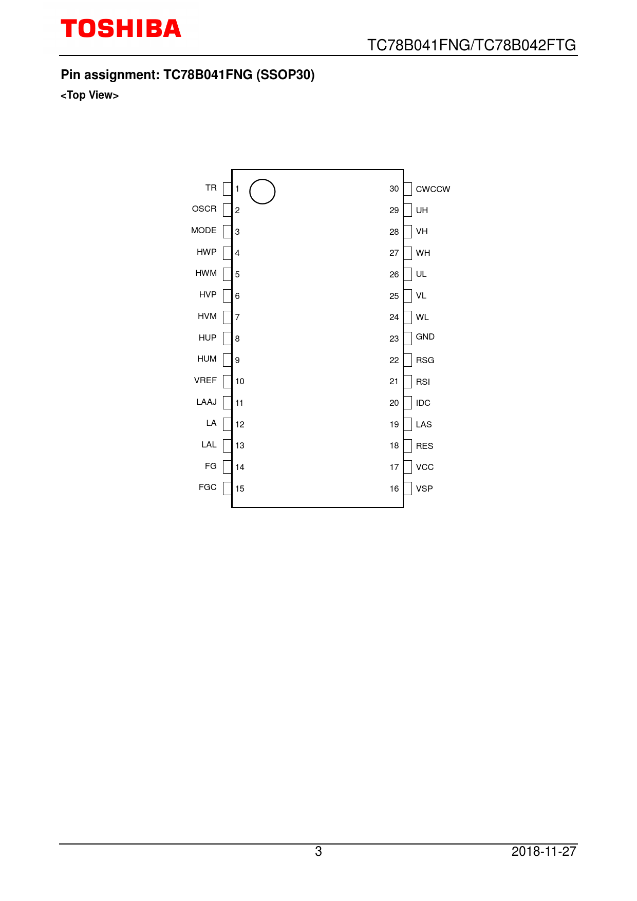 | Seiten / Seite | 44 / 3 — Pin assignment: TC78B041FNG (SSOP30). <Top View> |