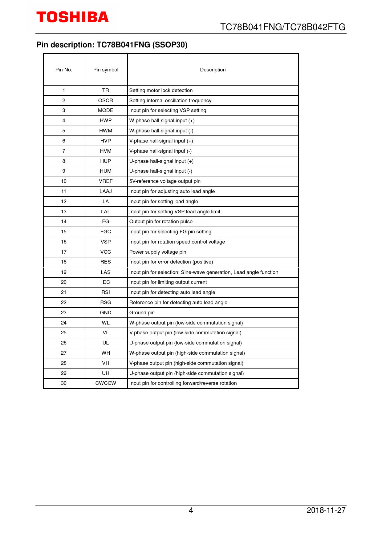 | Seiten / Seite | 44 / 4 — Pin description: TC78B041FNG (SSOP30) |