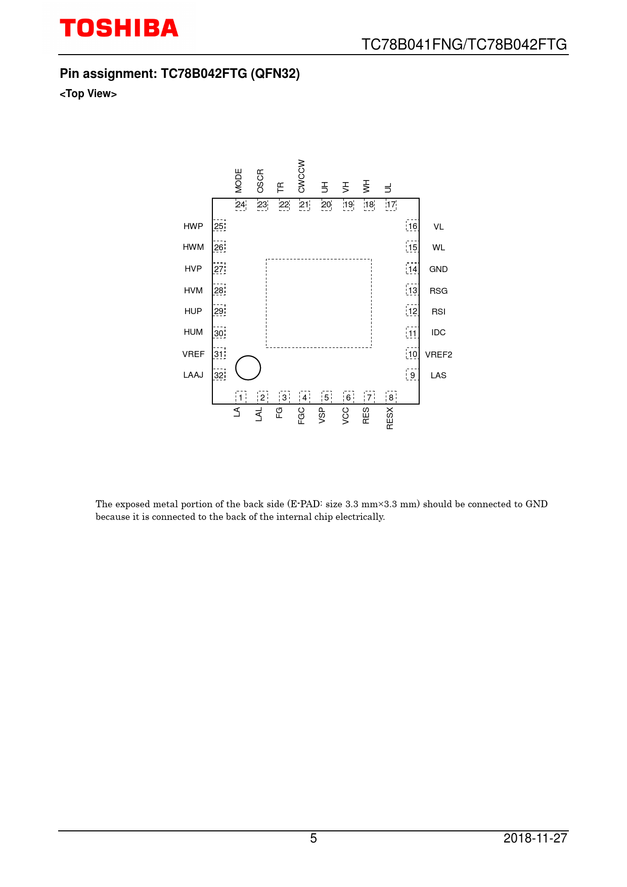 DE CR CCW O S H M O TR CW UH VH W UL 24 23 22 21 20 19 18 17 HWP 25 16 VL HWM 26 15 WL HVP 27 14 GND HVM 28 13 RSG HUP 29 12 RSI HUM 30 IDC 11 VREF 31 10 VREF 2 LAAJ 32 9 LAS 1 2 3 4 5 6 7 8 L S LA FG SP GC CC LA F V V RE ESX R The exposed metal portion of the back side (E-PAD: size 3.3 mm×3.3 mm) should be connected to GND because it is connected to the back of the internal chip electrically. 5 2018-11-27