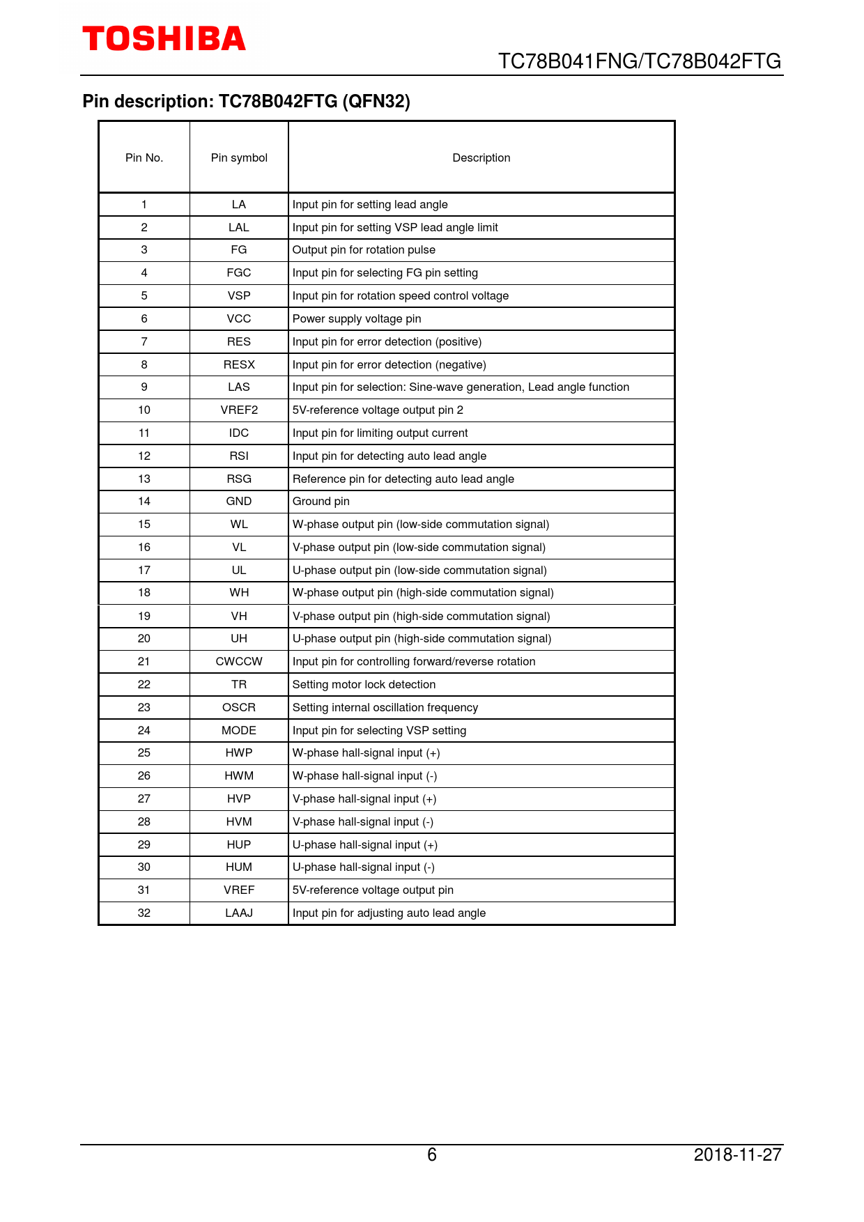 | Seiten / Seite | 44 / 6 — Pin description: TC78B042FTG (QFN32) |