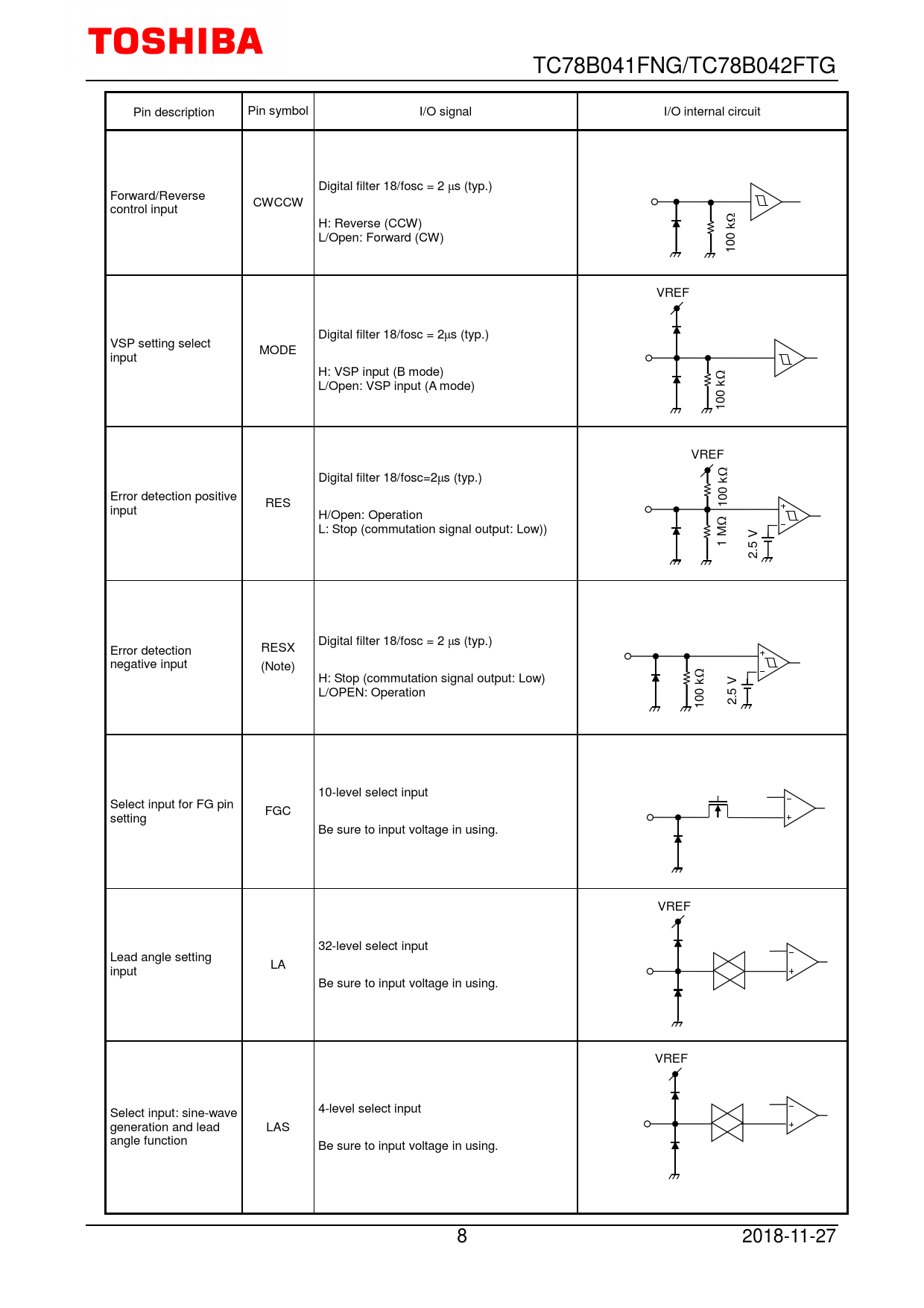 TC78B041FNG/TC78B042FTG Pin description Pin symbol I/O signal I/O internal circuit Digital filter 18/fosc = 2 μs (typ.) Forward/Reverse