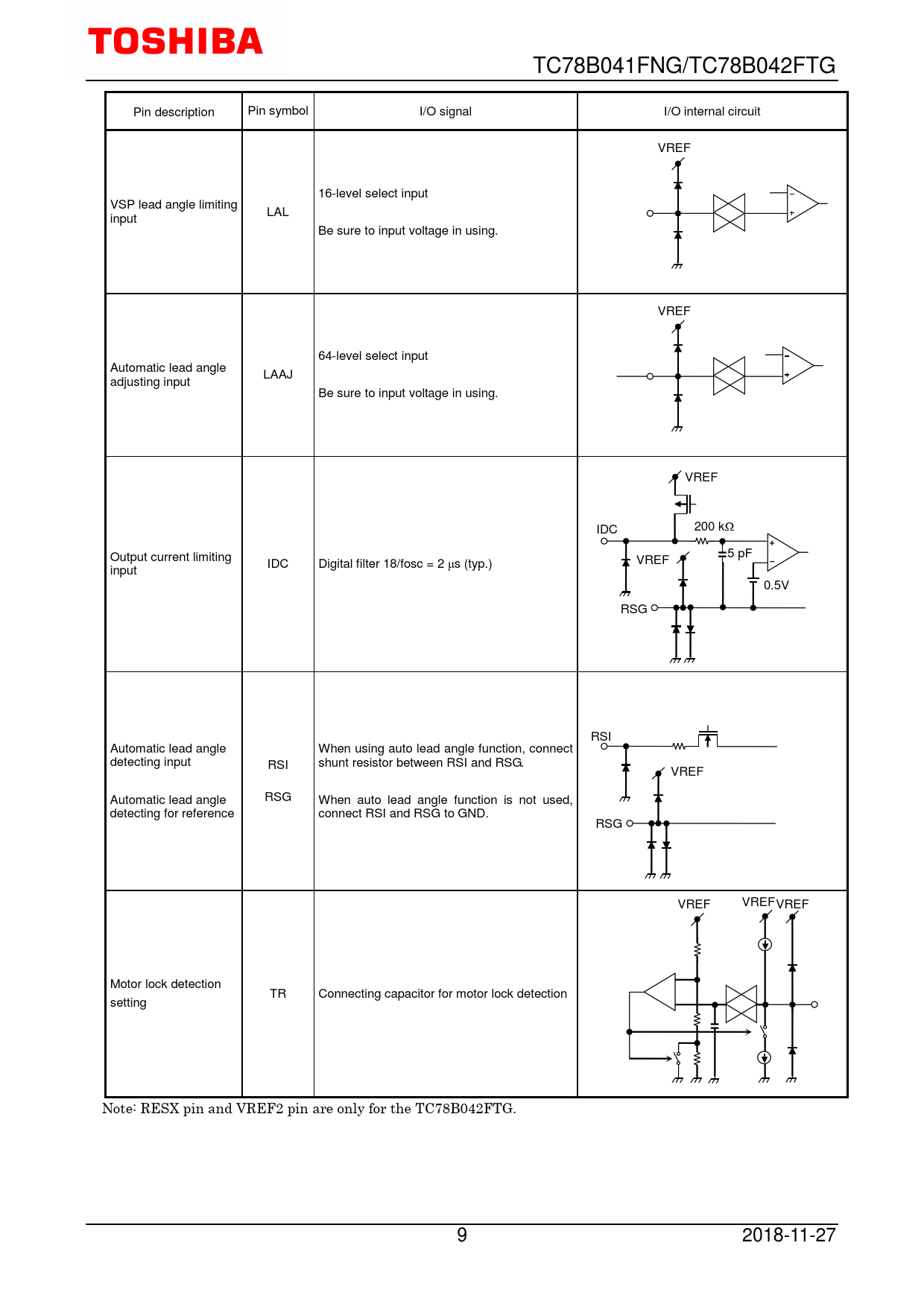 TC78B041FNG/TC78B042FTG Pin description Pin symbol I/O signal I/O internal circuit VREF 16-level select input VSP lead angle limiting LAL