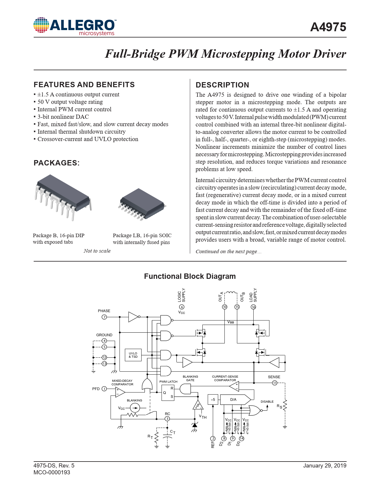 A4975. Full-Bridge PWM Microstepping Motor Driver. FEATURES AND BENEFITS. DESCRIPTION. PACKAGES:. Functional Block Diagram