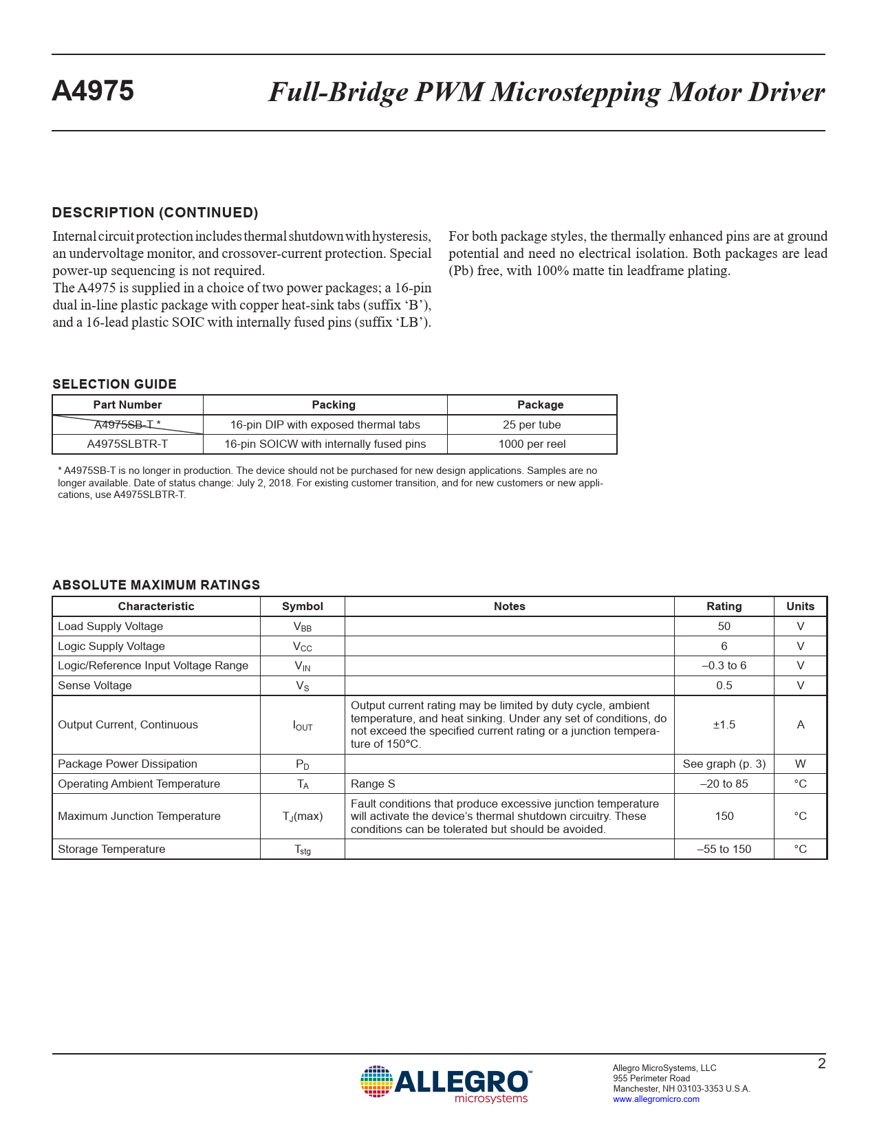 A4975SB-T * 16-pin DIP with exposed thermal tabs 25 per tube A4975SLBTR-T 16-pin SOICW with internally fused pins 1000 per reel * A4975SB-T is no longer in production. The device should not be purchased for new design applications. Samples are no longer available. Date of status change: July 2, 2018. For existing customer transition, and for new customers or new appli- cations, use A4975SLBTR-T.
